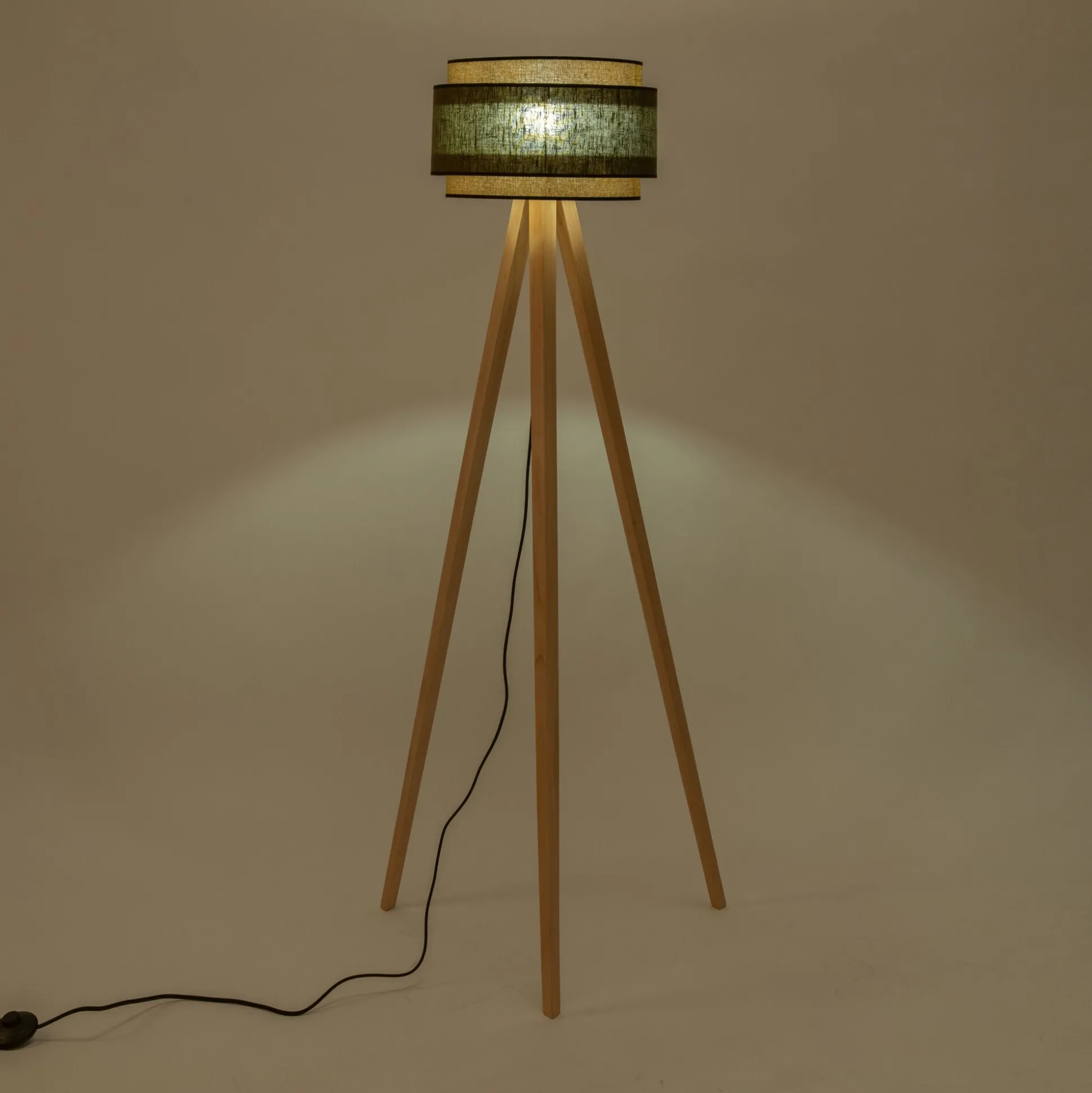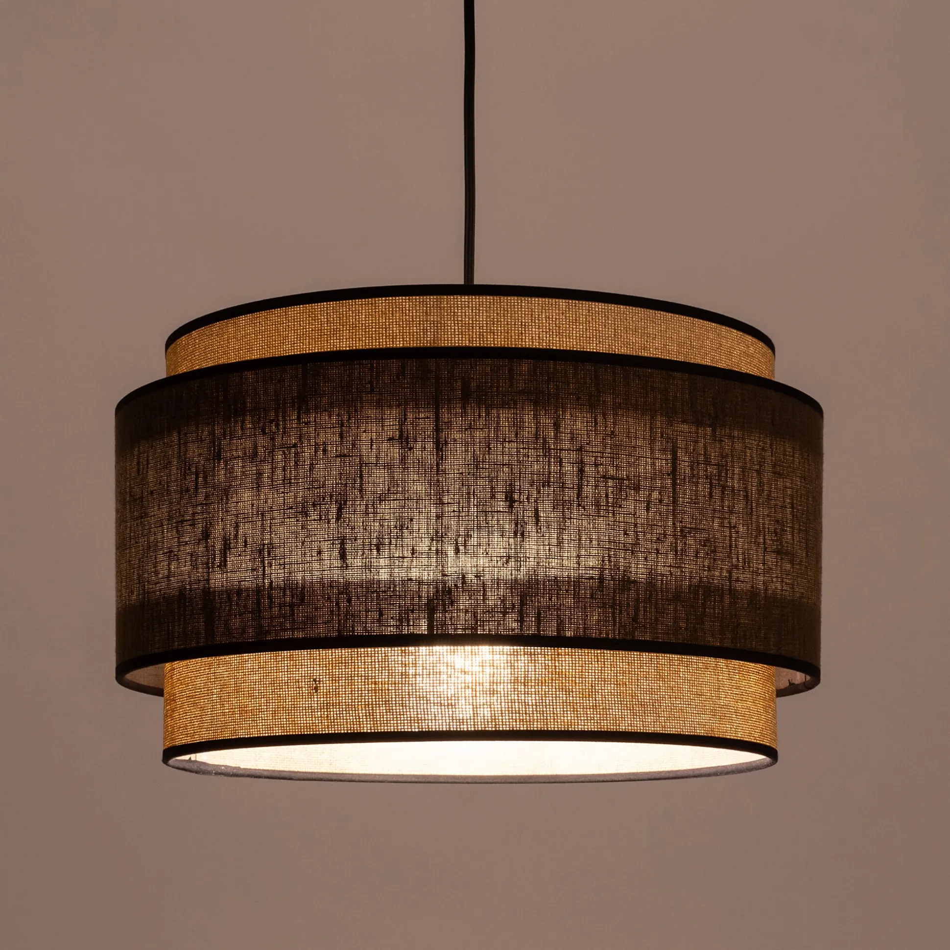 Abat-jour avec empilement de 3 cylindres en tissu et en papier tressé certifié FSC sur support plastique transparent.