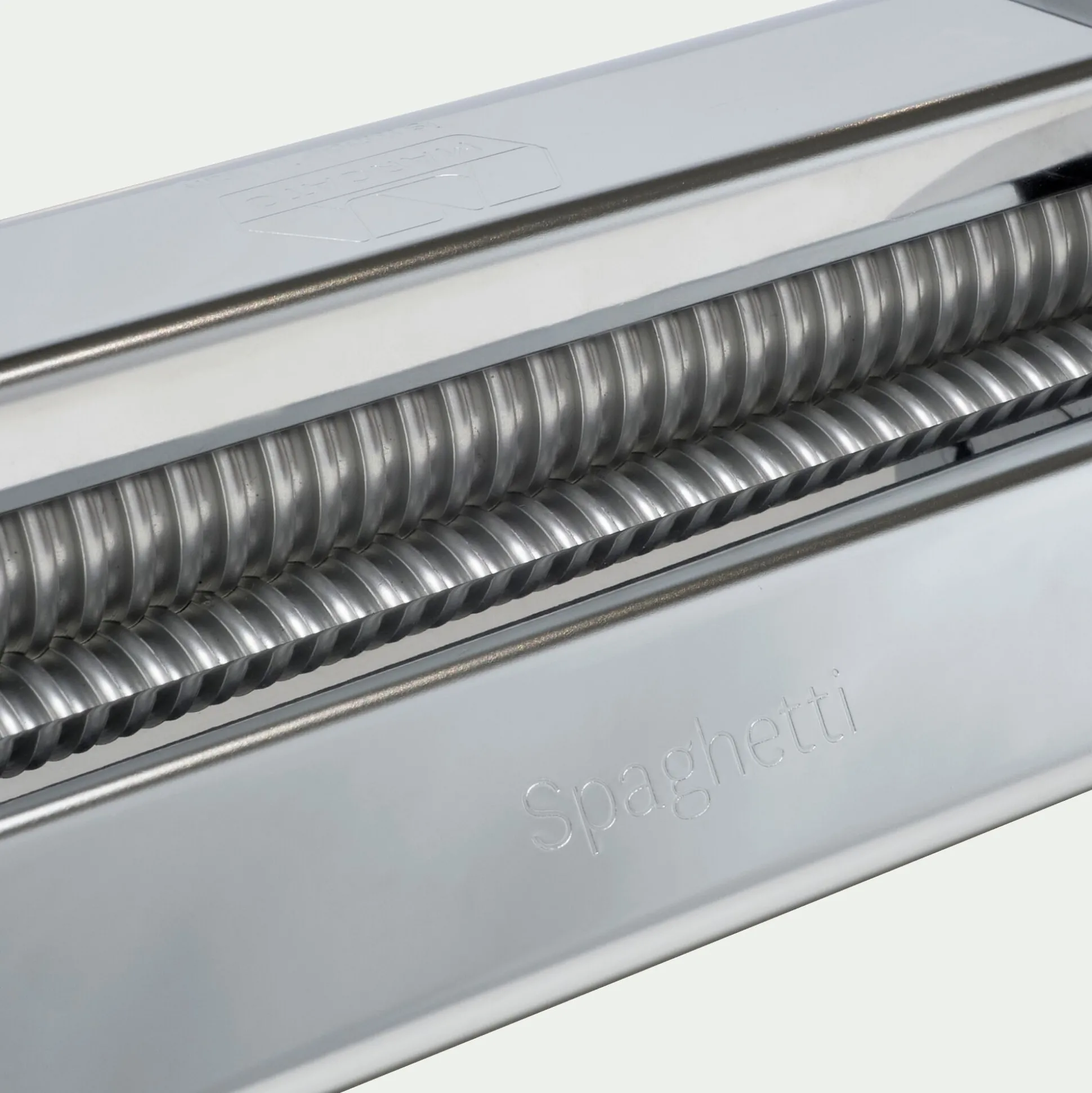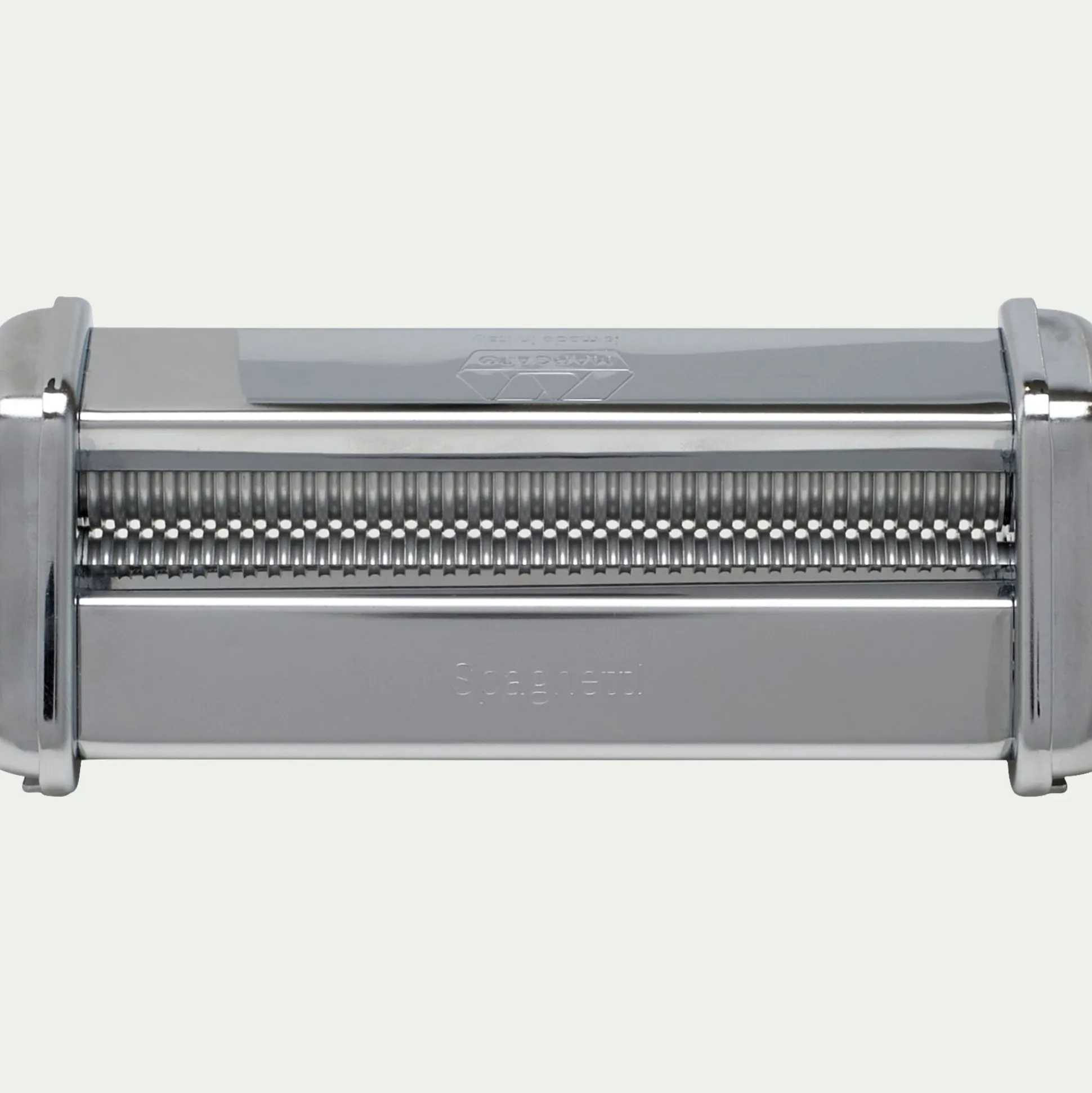 Complétez votre machine à pâtes d’un rouleau spécial pour confectionner vous-même vos spaghettis. Pâtes emblématiques appréciées de tous, les spaghettis vous feront voyager en Italie. En quelques secondes, cet accessoire se fixe à votre lamineuse. Il ne vous reste plus qu’à insérer votre pâte préparée avec amour pour réaliser un plat fait-maison. Les pâtes fraiches conquièrent le cœur et l’estomac de vos invités : le tour est joué. En acier chromé, cet ustensile se cuisine au design italien apporte une touche contemporaine à l’espace.