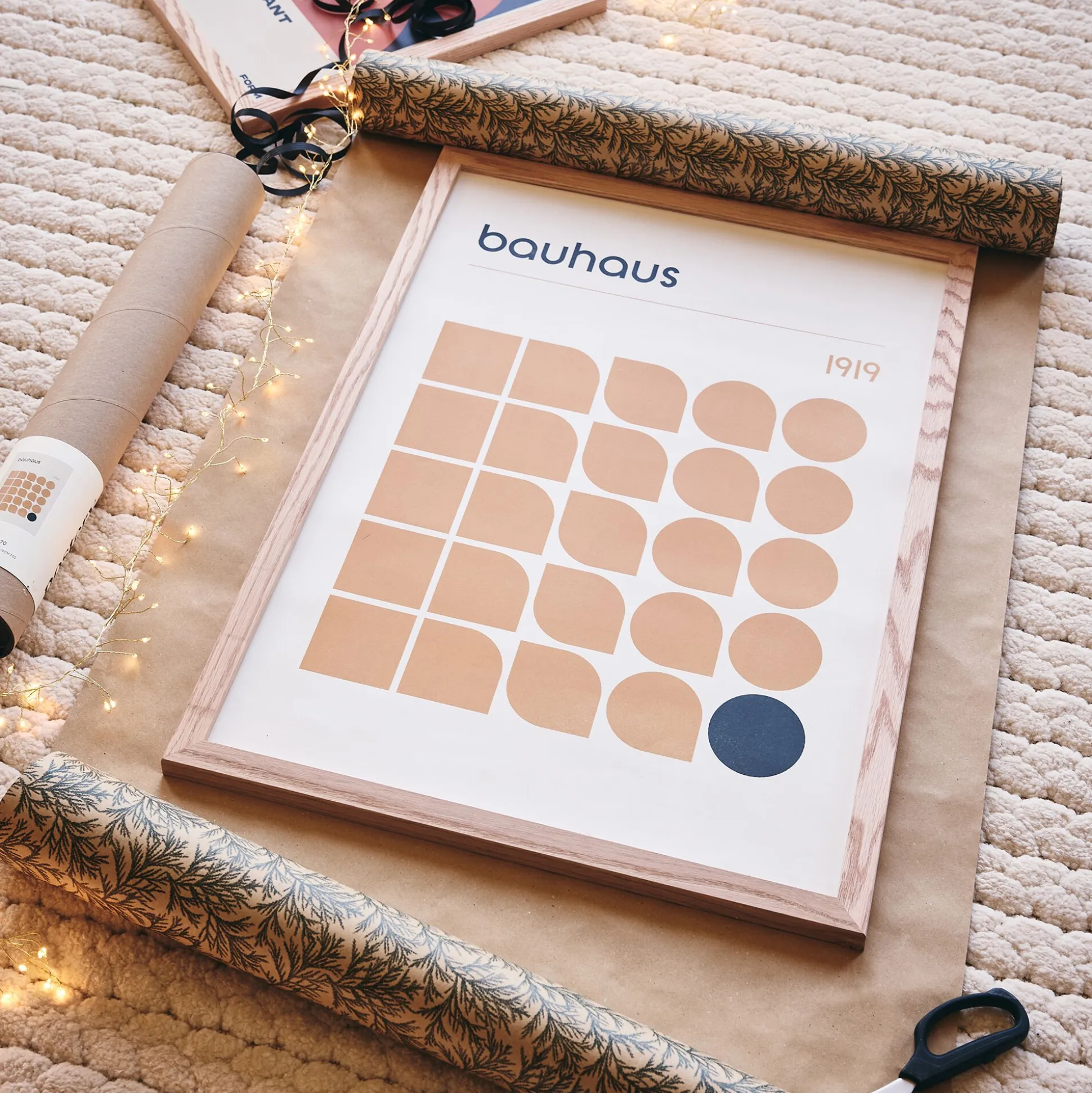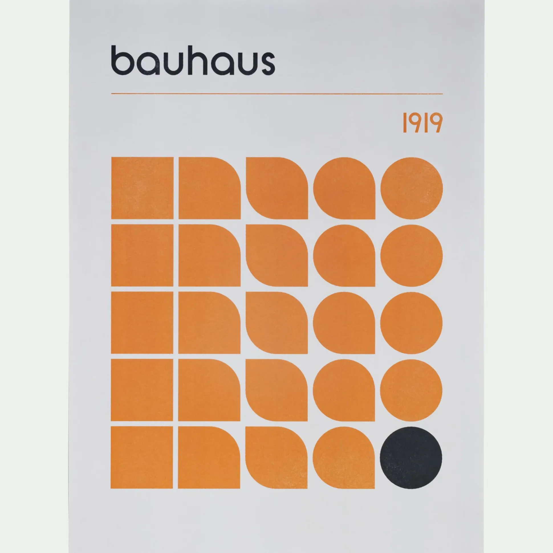 De 50×70 cm, l’affiche Bauhaus 1919 reprend les codes de ce mouvement si particulier : couleur et formes minimalistes. Les carrés s’adoucissent doucement pour devenir des ronds, dans un coloris terracotta chaleureux. Un unique rond noir vient créer du contraste et mettre un point final à cette décoration murale graphique.