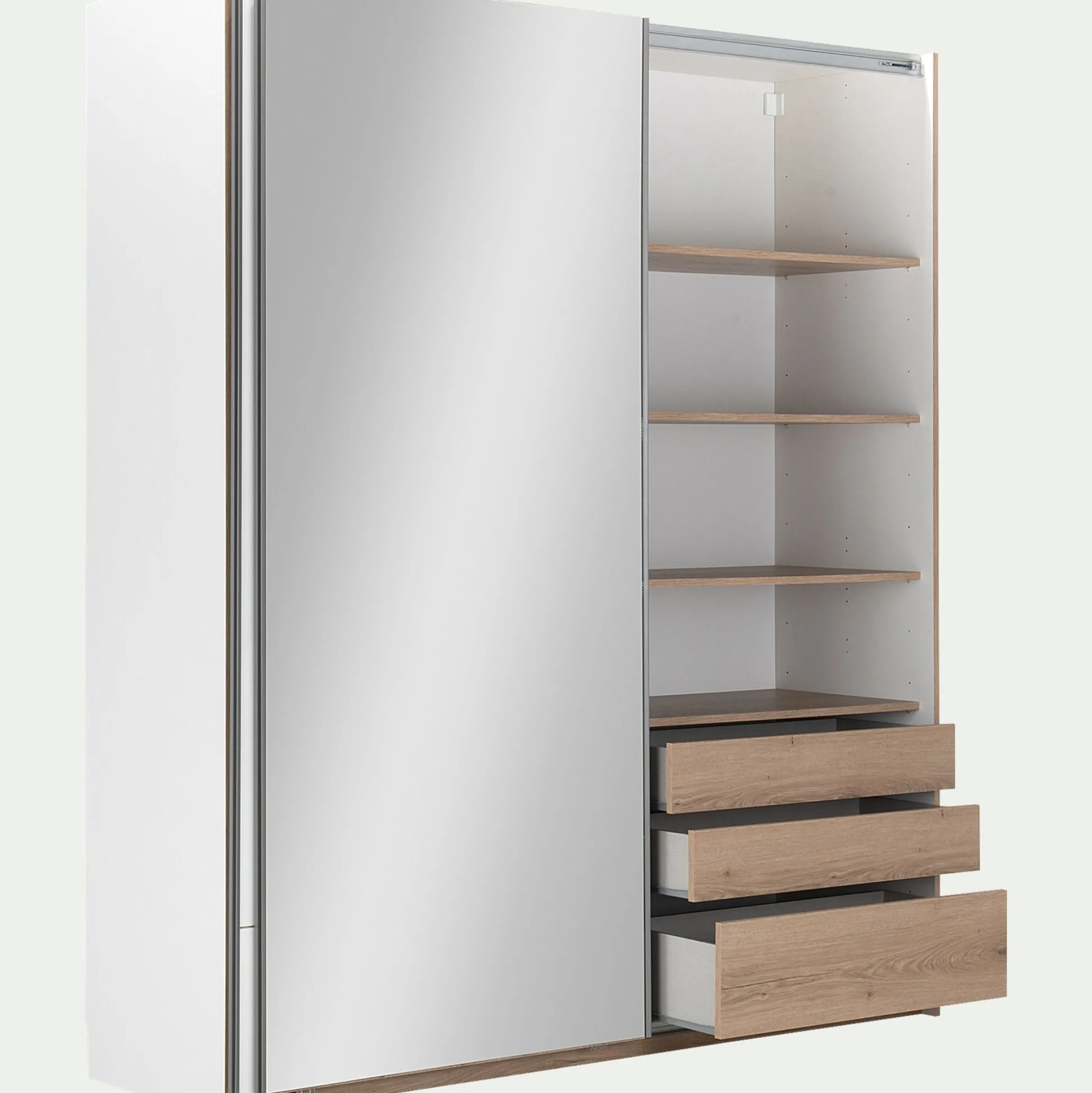 Ici, découvrez un dressing avec deux portes coulissantes, de couleur blanche. Ce meuble vous offre de beaux volumes pour y ranger vos affaires. Vous pouvez choisir cette pièce seule ou associée à un des éléments de la gamme. Chaque module est indépendant, mais ils se complètent aussi parfaitement entre eux. Ce sont des produits de qualité qui vous sont proposés, avec une finition en mélanine et une impression effet bois au toucher. Résistants, ces meubles dureront dans le temps. Le montage de ces derniers est très aisé et se fait en vertical. Les coins des modules sont découpés afin de laisser passer les plinthes et que vous puissiez placer vos meubles contre le mur.