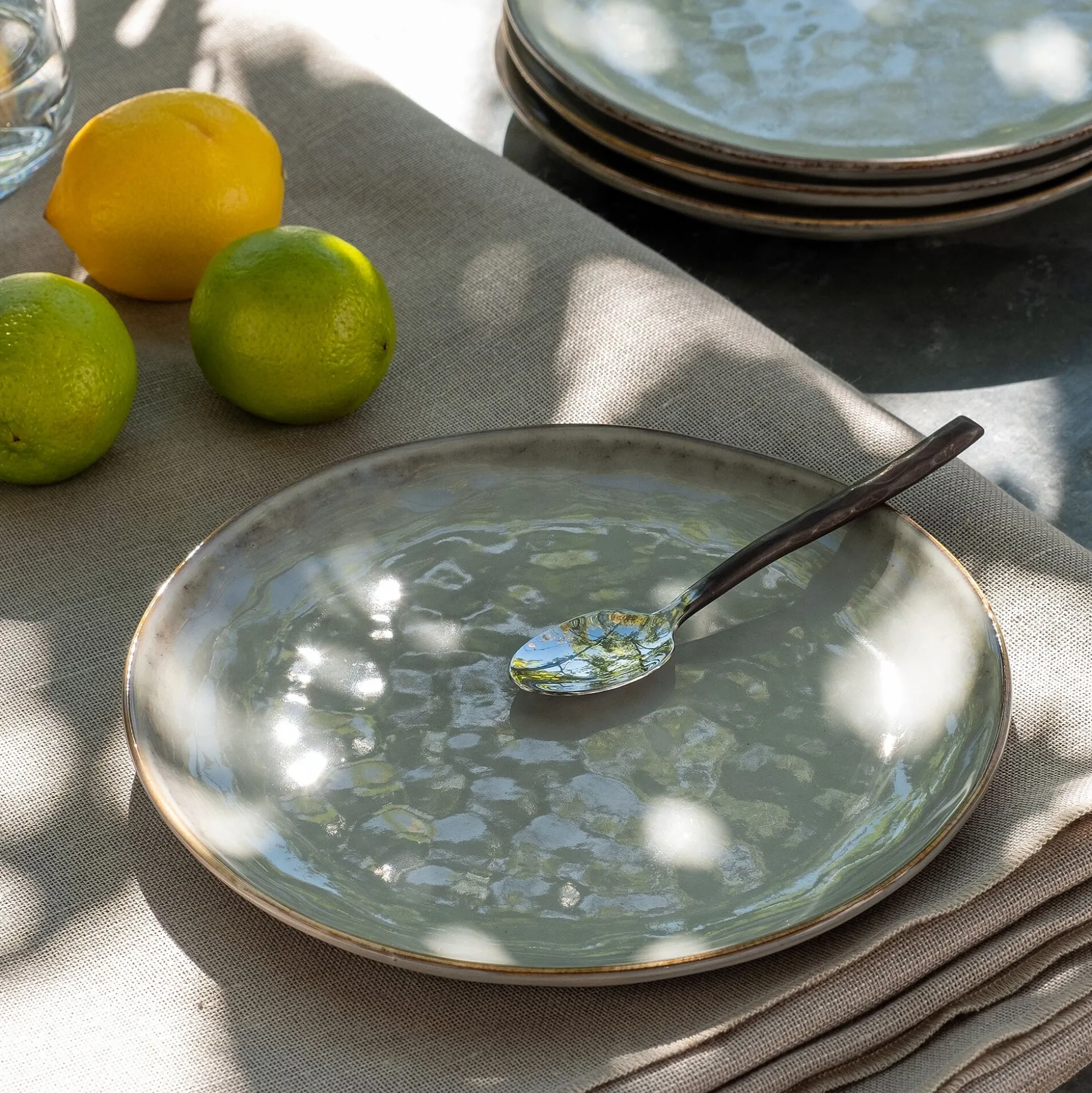 Découvrez cette belle assiette à dessert en grès vert qui apportera de l’authenticité à votre dressage de table. Ces magnifiques imperfections donnent du caractère à cette vaisselle. Elle s’inspire de la nature pour vous proposer un design minéral qui ravira vos convives. La subtilité de sa forme saura mettre en avant vos gourmandises sucrées et vous pourrez l’associer aux autres assiettes de la gamme afin de créer un bel ensemble.