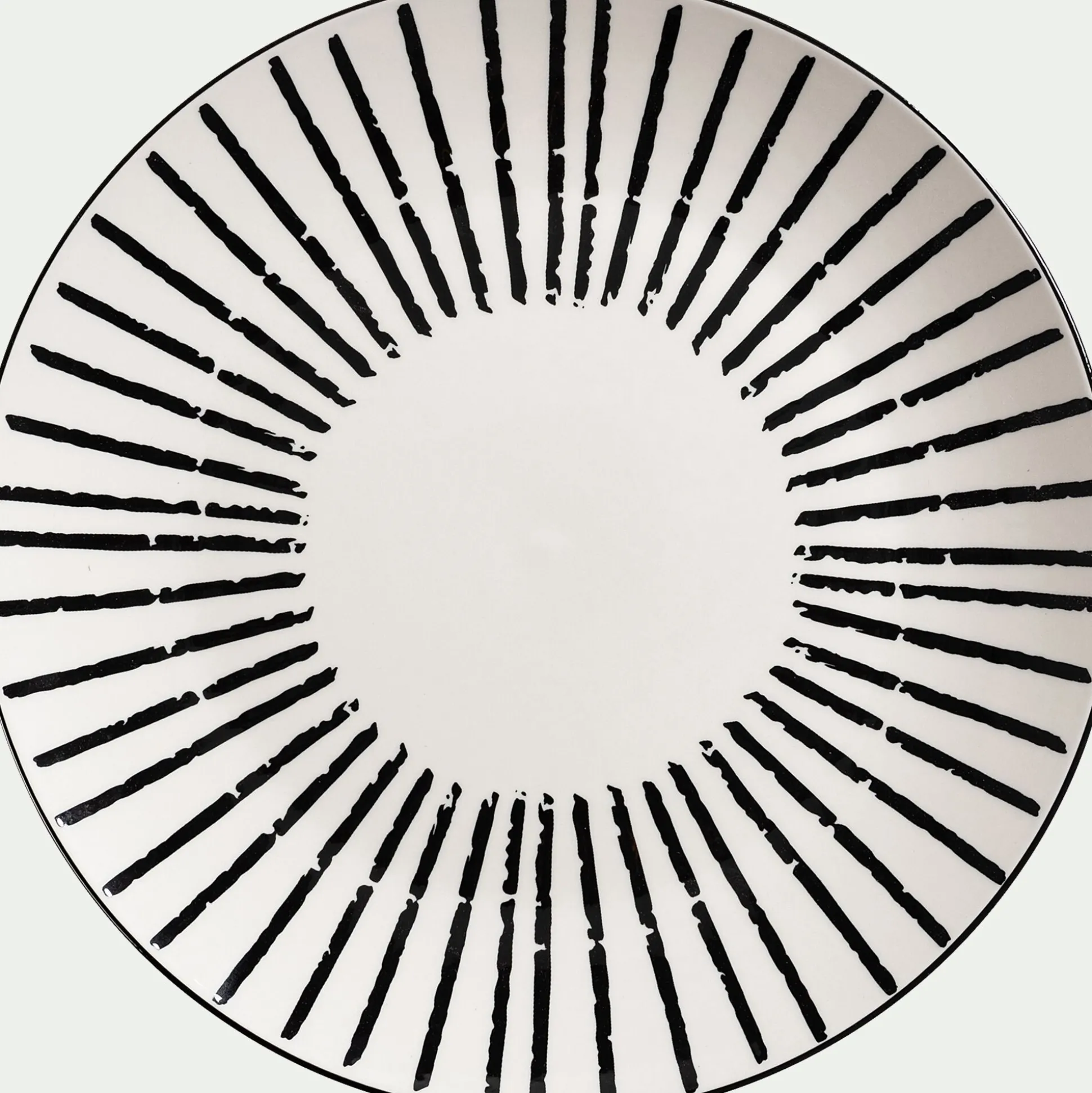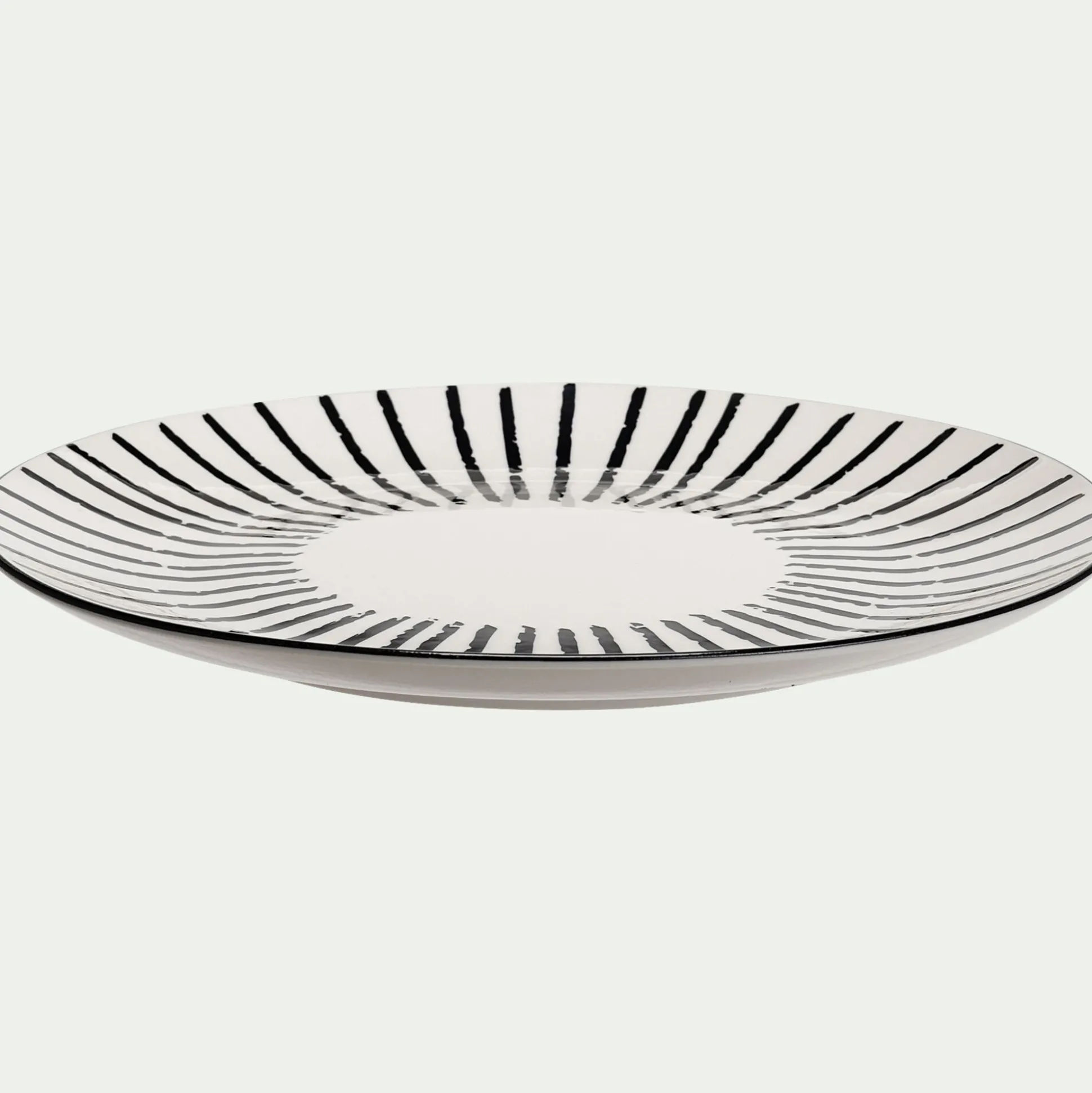 Élément indispensable de l’art de la table, l’assiette plate rejoint le dressage pour servir le plat principal. Cette vaisselle vous accompagnera lors de tous vos repas. En blanc et noir, cette assiette en porcelaine arbore un motif abstrait qui joue sur le contraste des couleurs. Une belle pièce résistante qui s’utilise au quotidien grâce à sa compatibilité avec le lave-vaisselle et le micro-ondes.
