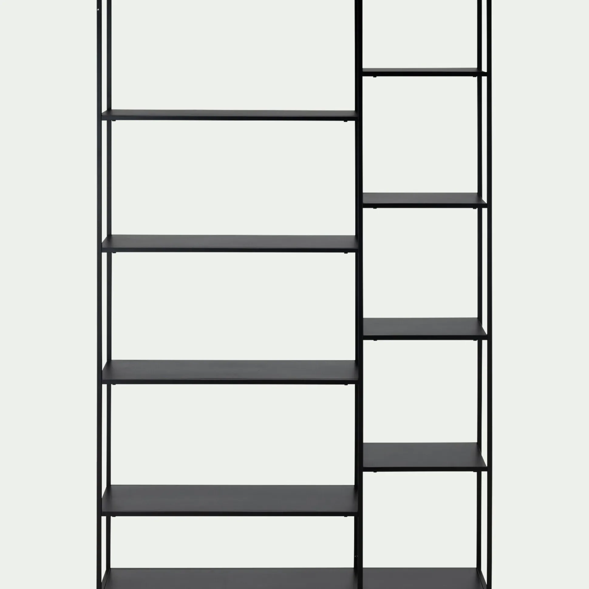 Cette belle bibliothèque à la structure fine et au style contemporain vous permettra de disposer vos objets déco et vos livres. Vous apprécierez ses lignes épurées et son design moderne. Cette bibliothèque noire présente une structure et des étagères en métal qui lui confère un style chic et élégant. Elle trouvera aisément place dans votre salon, afin de compléter avec charme la déco de votre pièce de vie et le mobilier existant.