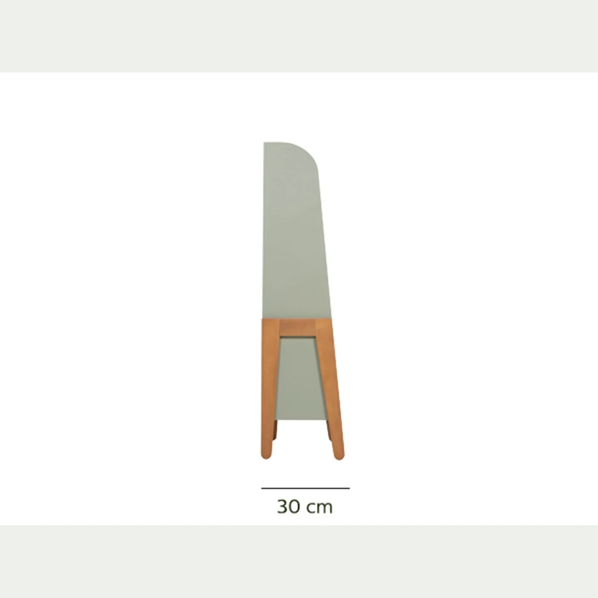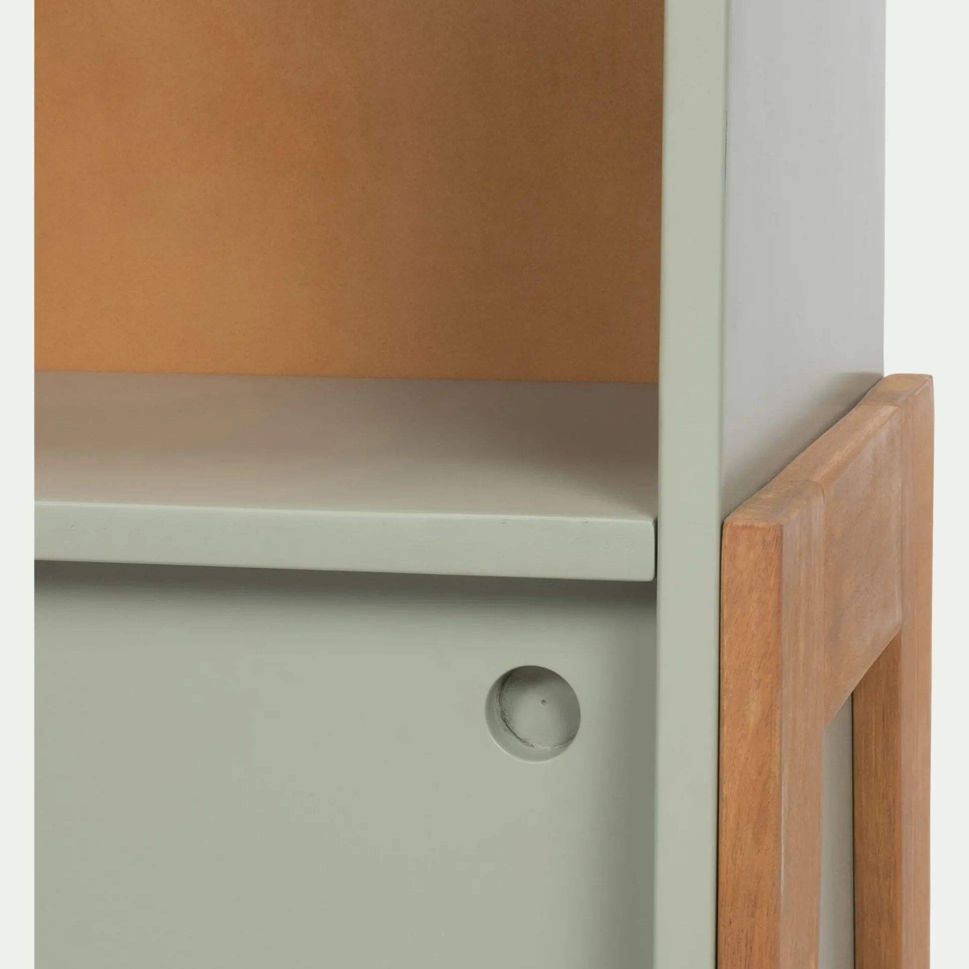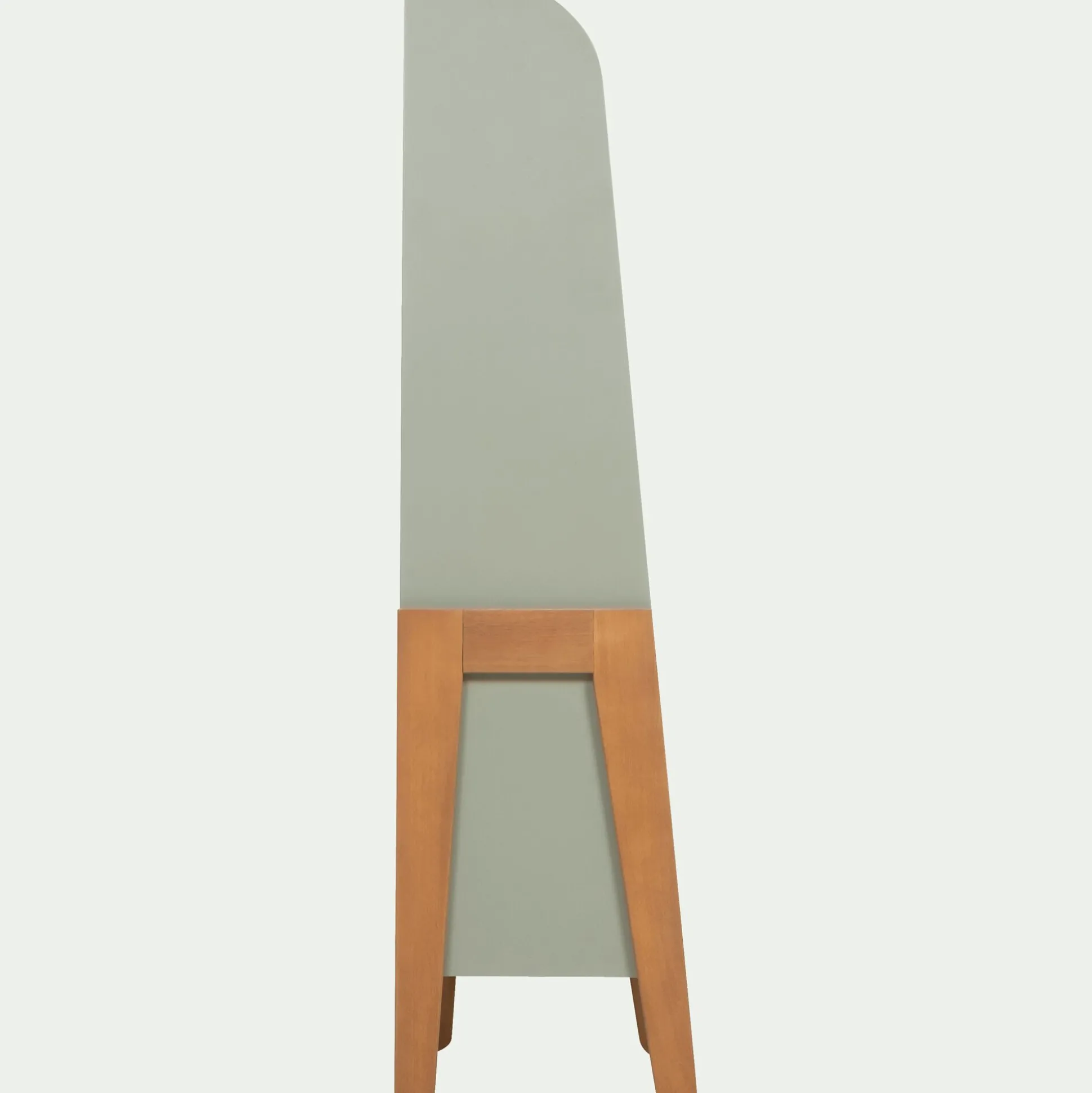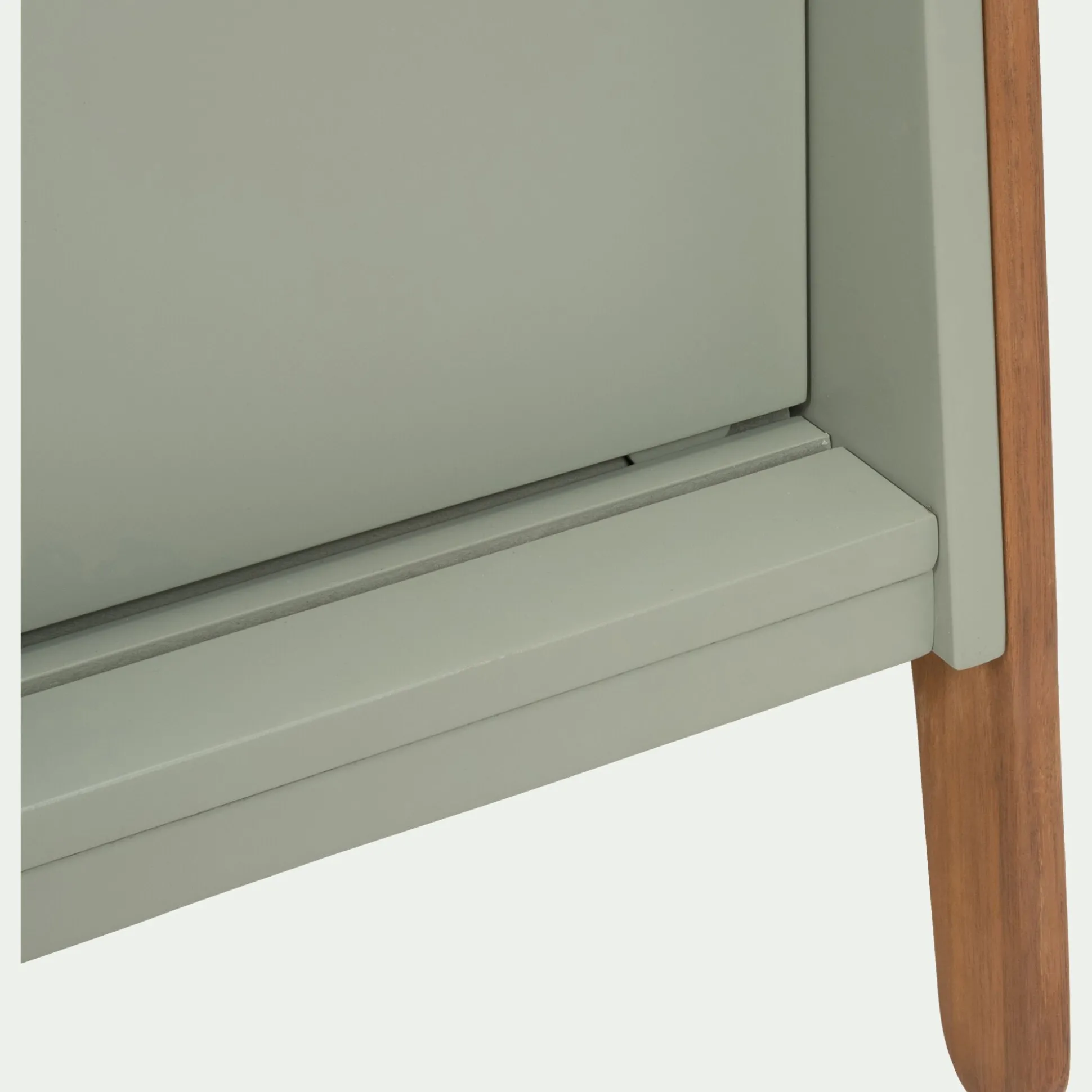 Acacia et MDF avec une finition huilé couleur teck et finition lasuré vert.