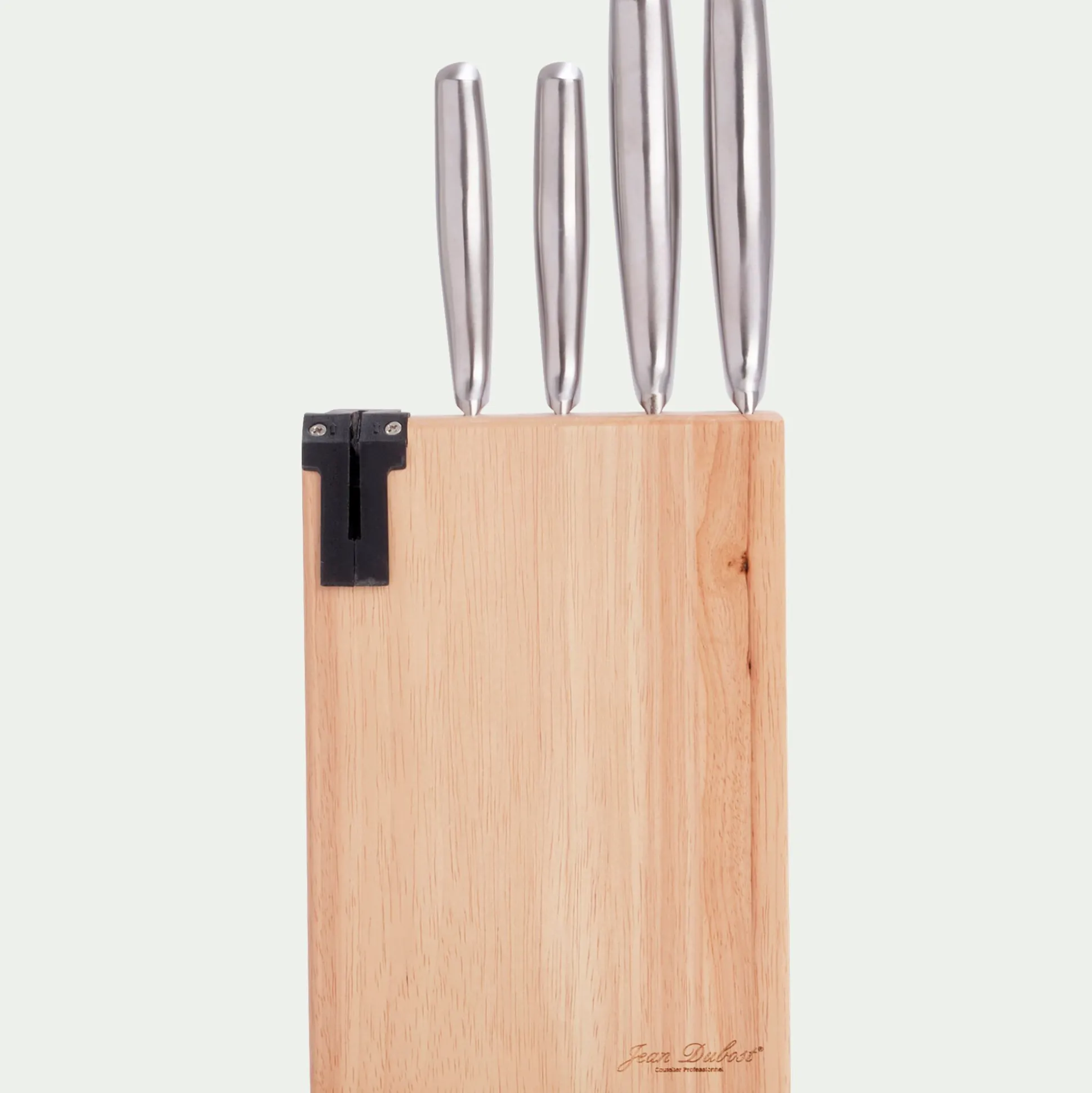 Elevez votre technique en cuisine avec les couteaux Fusal. Ces 4 couteaux en inox sont présentés dans un bloc en hévéa, une essence de bois claire et chaleureuse. Chacun a sa propre fonctionnalité. Il y a donc un couteau de chef, un couteau à pain, un couteau multi-usages et enfin un couteau d’office. Ensemble, ces couteaux Jean Dubost vous permettent de réaliser tous types de tâches en cuisine. Un affuteur est inclus au support, vous permettant ainsi de garder vos couteaux toujours bien aiguisés et fonctionnels. Ce porte-couteaux en bois se glisse sur le plan de travail et reste à portée de main, tout en apportant une touche décorative à l’espace.