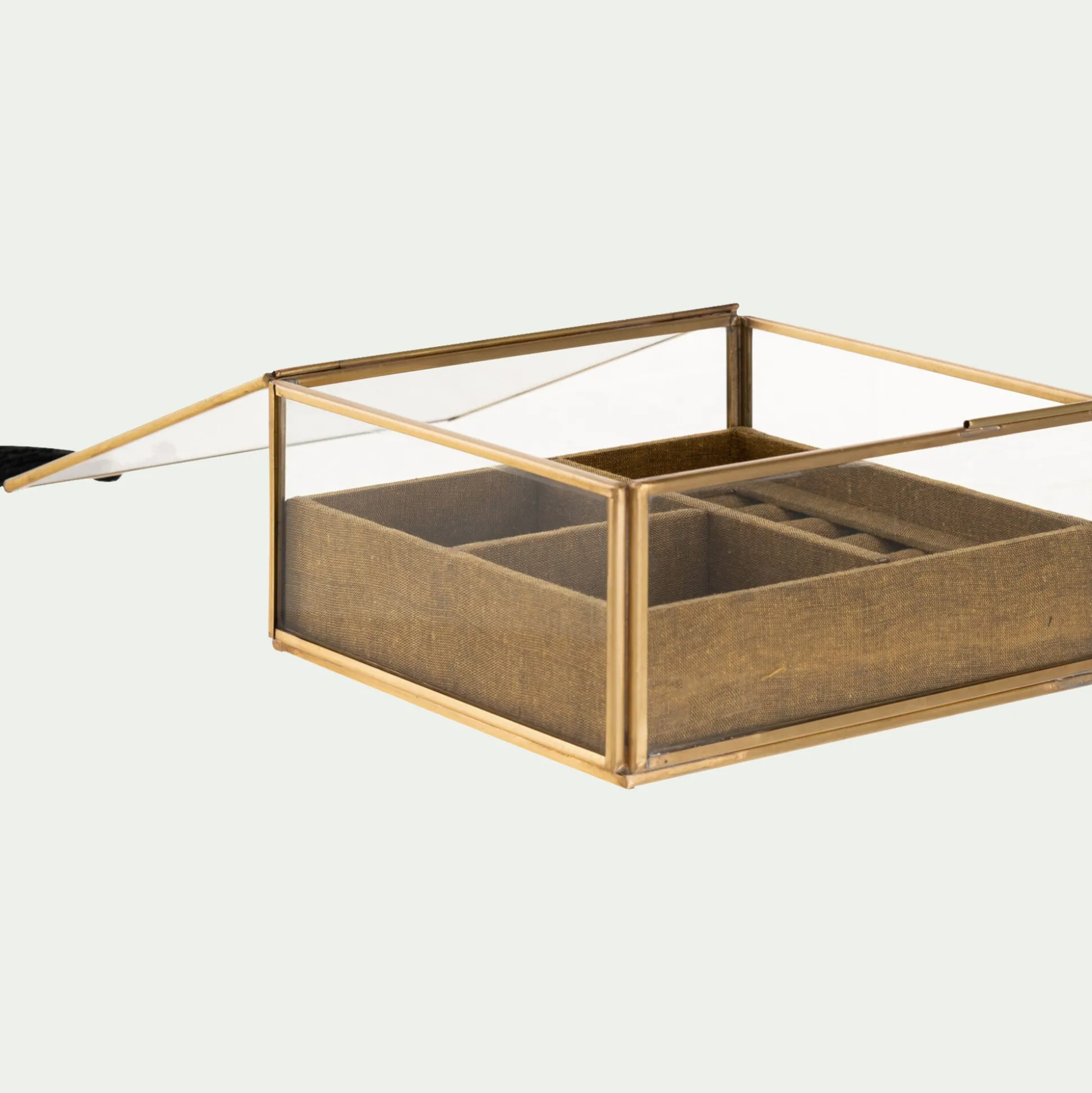 Organizer votre chambre et ne perdez plus aucun de vos bijoux préférés grâce à cette jolie boite à bijoux. Avec ses petits rangements, cette boite carrée est parfaite pour y déposer vos bijoux afin qu’ils soient toujours ordonnées. Elle est composée de plusieurs compartiments afin que vous puissiez classer vos bagues, colliers, bracelets et boucles d’oreilles. En laiton et en verre, elle donne un style distingué à votre décoration. Posée sur votre commode ou encore sur votre coiffeuse, elle apporte du cachet en habillant vos meubles. Ce rangement de 15,5×15,5 cm est à la fois pratique et esthétique et donnera du charme à votre pièce.