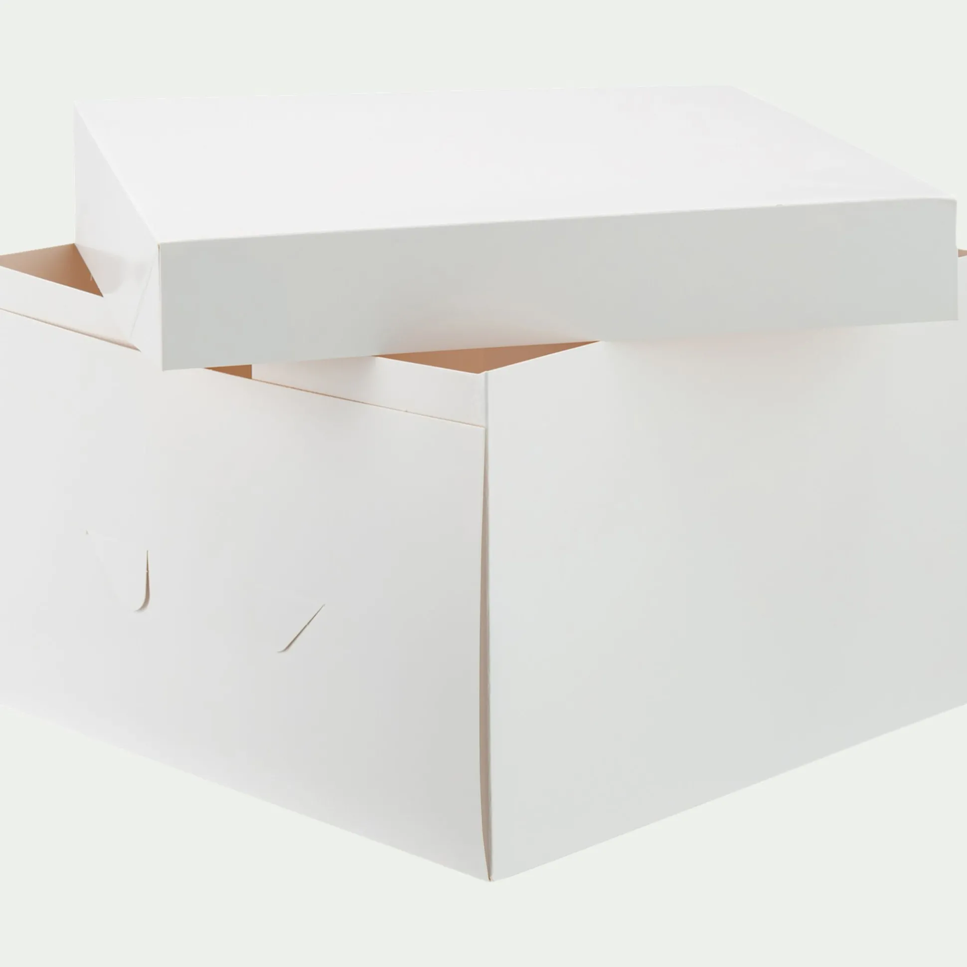 Cette boîte pâtissière de 20 cm de haut est idéale pour transporter et protéger des gâteaux hauts. Son assemblage est rapide et facile, grâce à une conception pratique comprenant un couvercle ajusté. Conforme aux normes de contact alimentaire, elle garantit la sécurité de vos créations. Réutilisable, cette boîte en carton blanc allie durabilité et respect de l’environnement, puisqu’elle peut être recyclée après utilisation. Son design épuré fait de cette boîte un choix parfait pour transporter vos gâteaux avec élégance et sécurité, tout en facilitant le montage et le nettoyage.