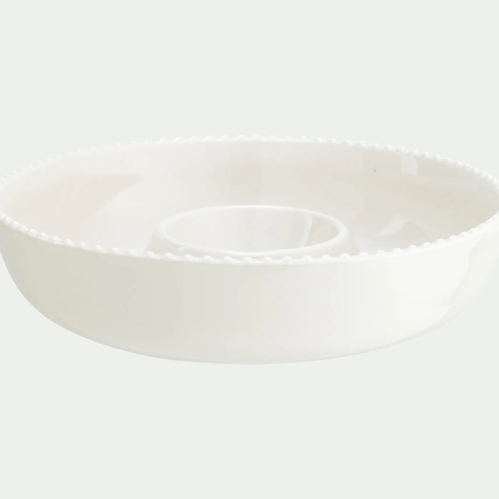 Ce bol apéritif en porcelaine blanche, à la fois élégant et résistant, ajoute une touche d’éclat à la présentation de votre table. Conçu en deux compartiments, il permet de servir deux apéritifs différents ou d’offrir un espace pour disposer les déchets comme des noyaux d’olive ou des coques de cacahuètes. Son design raffiné et fonctionnel fait de ce bol un indispensable des moments conviviaux, alliant simplicité et utilité pour une expérience parfaite.