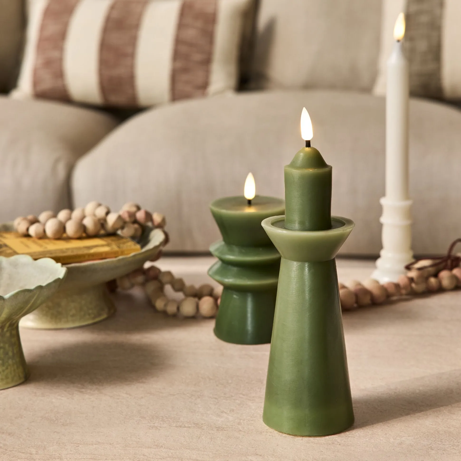 Naya est une bougie à LED qui associe authenticité et praticité. Confectionnée en cire de paraffine, elle affiche une silhouette contemporaine teintée en vert qui apporte du caractère à la décoration de Noël. Une petite ampoule en forme de flamme trône au sommet et diffuse une lumière blanc chaud, douce et apaisante. Fonctionnant avec 2 piles AAA (non incluses), cette bougie électrique s’allume grâce à un interrupteur discret. Pour plus de confort, son minuteur intégré l’éteint automatiquement après 6 heures d’utilisation. Un objet déco qui crée une atmosphère chaleureuse pour passer confortablement l’hiver.