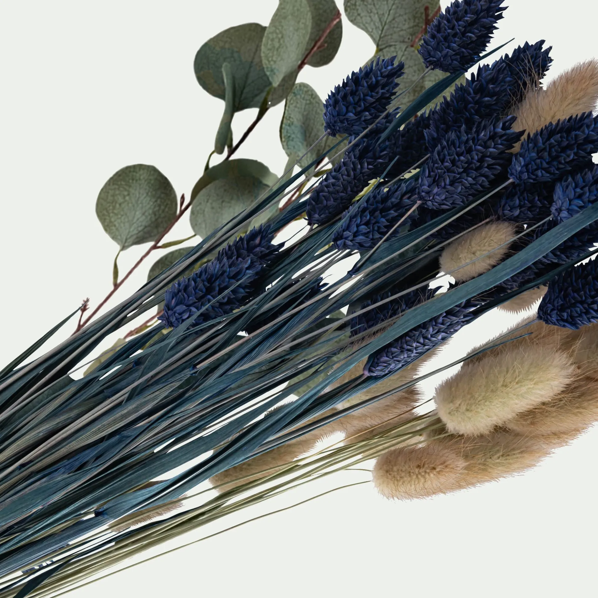 Un joli bouquet de fleurs séchées aux tons bleutés. Cette composition naturelle est composée de phalaris, de lagurus ovatus et d’eucalyptus espiral. Ce bouquet est parfait pour décorer votre maison. Dans un vase ou pour confectionner de jolies créations telles que des couronnes de fleurs séchées ou des herbiers, il donne du charme à votre pièce.