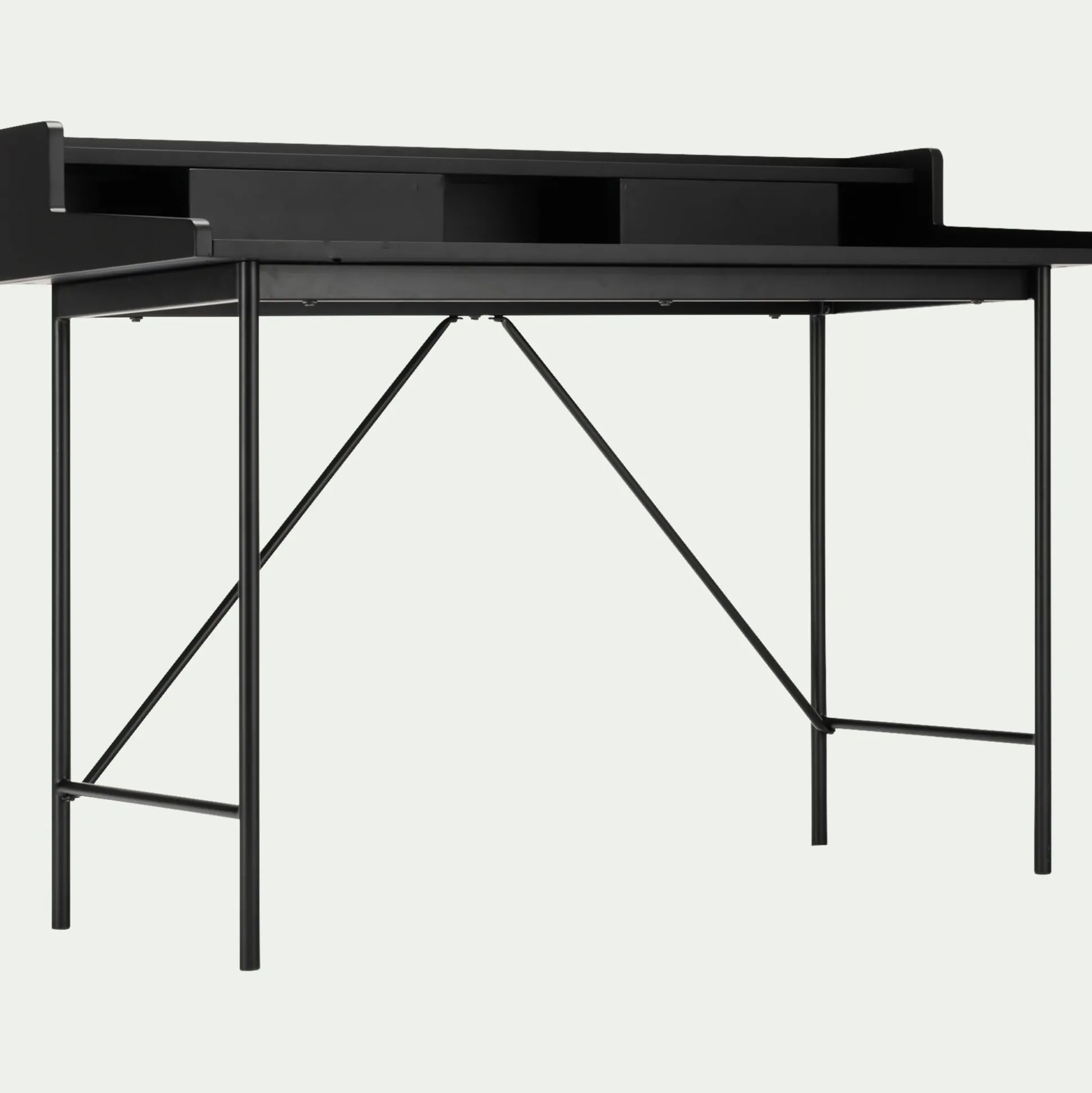 Lira est un bureau en bois aussi esthétique que pratique. Du plateau au piétement, ce bureau de travail est entièrement peint en noir mat. Ainsi, ce meuble d’accent apporte du contraste et de la profondeur à la pièce. Son total look noir le rend adaptable à tous les styles : moderne, contemporain, industriel… Un intemporel qui s’adapte aux saisons et à vos goûts. Ce bureau noir se compose d’un grand plateau principal et d’un petit plateau supérieur, idéal pour poser votre écran d’ordinateur. De cette façon, votre corps adopte naturellement une posture saine. Deux boîtes de rangement viennent compléter l’ensemble. L’occasion d’avoir un bureau organisé où travailler devient un plaisir.