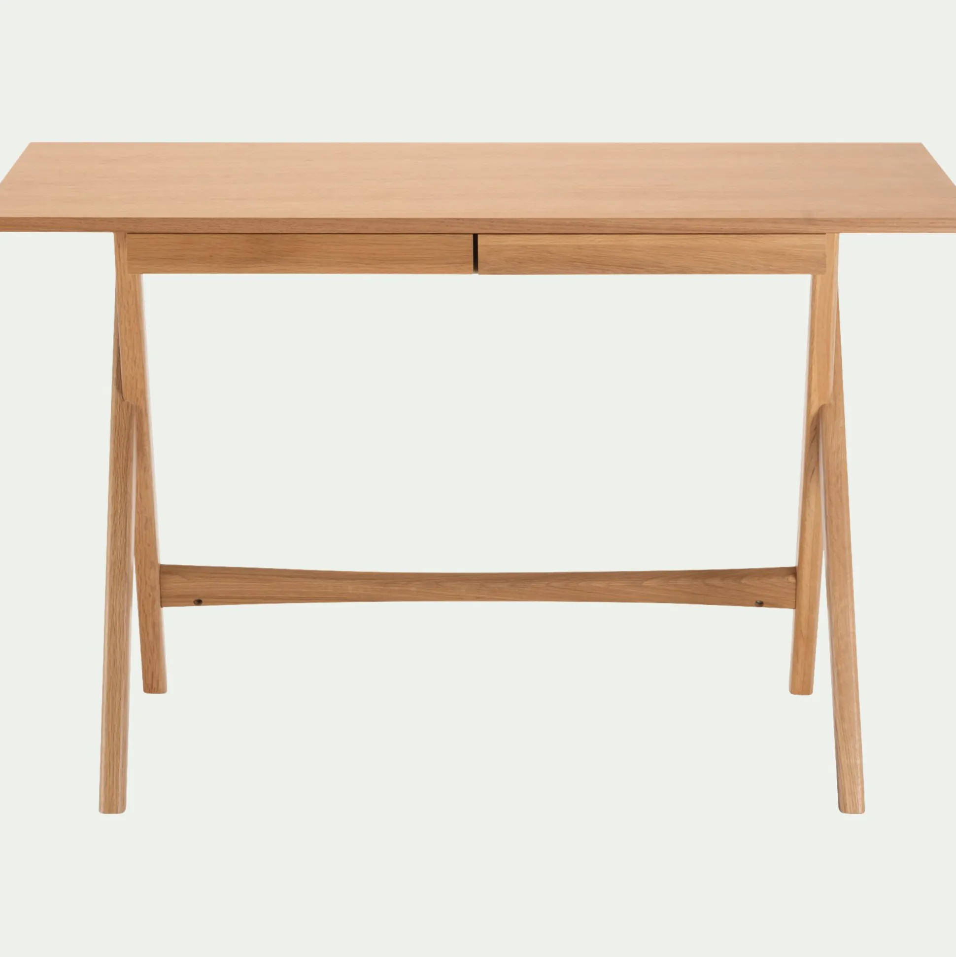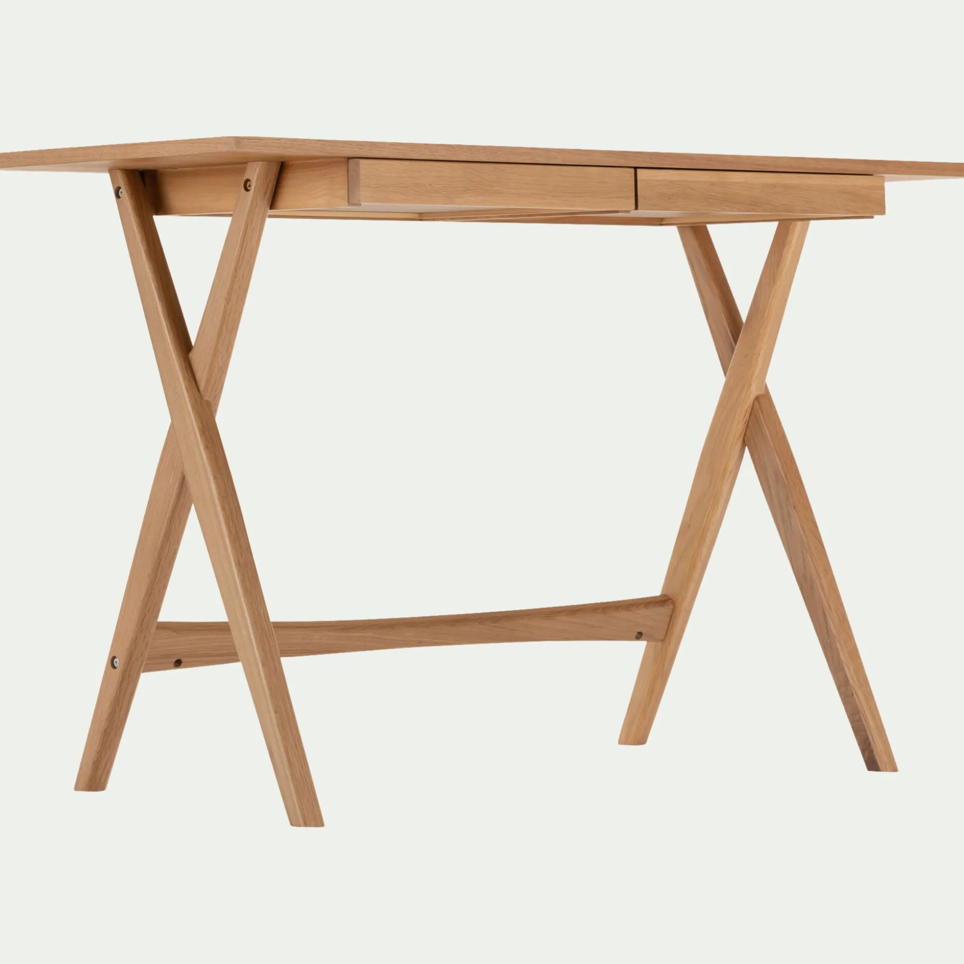 Aménagez un espace de travail chaleureux mais épuré avec le bureau en bois Losilla. Avec son piètement inspiré des tréteaux, ce bureau en chêne a une allure subtilement vintage. De 50×170 cm, le plateau offre un bel espace où installer son poste de travail. Avec ses deux tiroirs intégrés, ce bureau propose des espaces de rangement, parfaits pour y glisser des documents et garder un coin travail organisé. Ce bureau fixe est laissé au naturel et insuffle dans la pièce un vent d’authenticité.