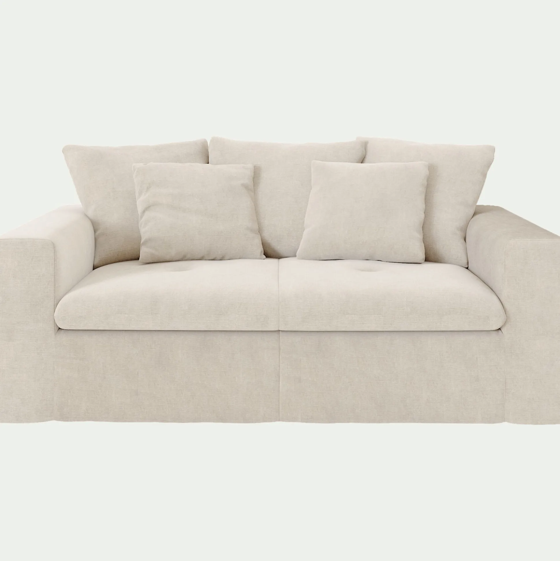 Laissez vous séduire par le charme du canapé Elea, un meuble pensé pour sublimer votre salon. Ce canapé 2 places fixe allie à la fois esthétisme et confort, pour un espace de vie chaleureux. Son dossier à l’accueil plume vous procure une sensation de bien-être douillet alors que sa profonde assise vous donne une impression cocooning d’enveloppement. Ses coussins de dossier, soigneusement jetés, accentuent son aspect accueillant tout en apportant une touche de décoration raffinée. Son surmatelas délicatement intégré confère à l’ensemble une sensation de légèreté fortement appréciable. En ce qui est du design, ses lignes épurées et sa jupe font de lui un atout charme intemporel. Revêtu d’un tissu doux de couleur beige, il vous permet de vous prélasser tout en apportant un côté lumineux et apaisant à votre pièce. Idéal pour la détente ou pour recevoir famille et amis, il incarne à merveille l’équilibre entre sophistication et confort inouï.