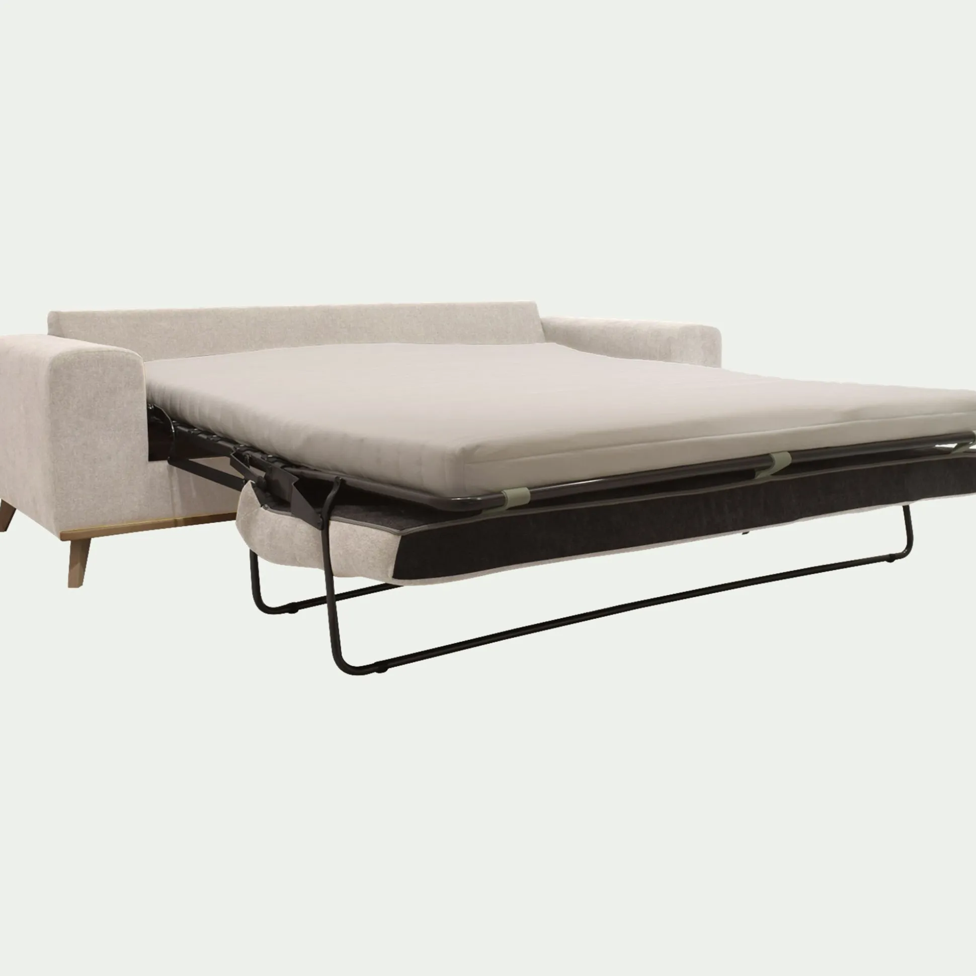 Le canapé 4 places convertible Capia allie confort, style et praticité. Ce canapé est revêtu du tissu Storm dans notre coloris beige roucas, lumineux et chic. De jour, ce canapé droit offre une assise spacieuse pour 4 personnes. Le soir venu, il se déplie en quelques secondes grâce à son système express et révèle un couchage de 160×188 cm. Son matelas intégré de 10 cm d’épaisseur est parfait pour un usage occasionnel, par exemple pour recevoir famille ou amis pour la nuit. Son tissage Oeko-tex apporte douceur et résistance, parfait pour une utilisation quotidienne. Son design repose sur une structure en pin massif et des pieds en hêtre massif, gage de solidité et de durabilité. Les coussins de dos déhoussables facilitent l’entretien. Une fabrication française qui conjugue esthétique et fonctionnalité.