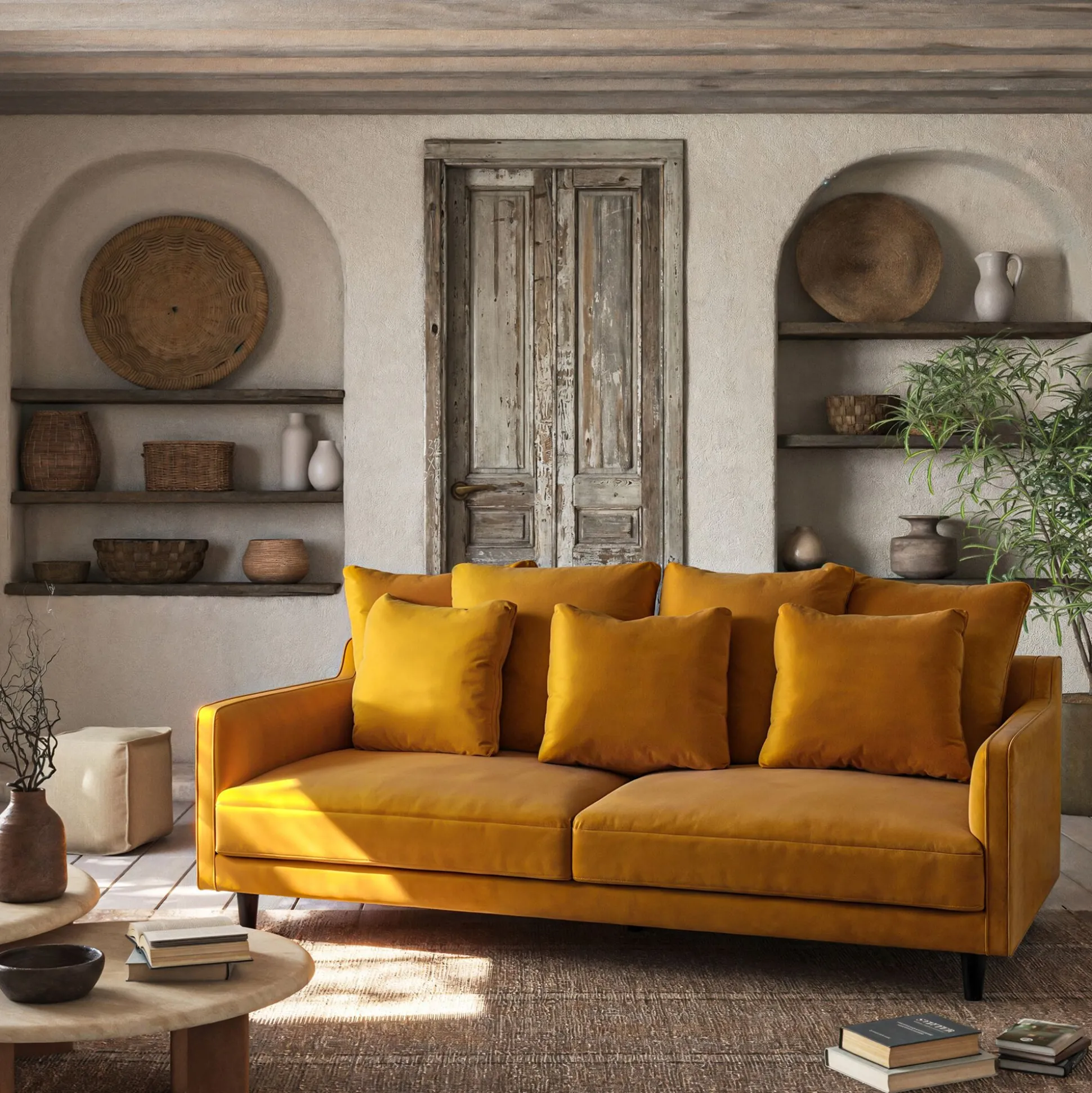 Ce canapé droit 4 places incarne l’élégance italienne dans une version chaleureuse et lumineuse. Revêtu du tissu velvet, au toucher charnu et à l’apparence de velours, il séduit par sa texture délicate et sa douceur exceptionnelle. Son coloris jaune argan illumine la pièce et insuffle une énergie solaire au décor. Fabriqué à la main en Italie, il témoigne d’un savoir-faire artisanal raffiné. L’assise, généreusement garnie de plumes d’oie, offre un confort moelleux et enveloppant. Monté sur des pieds en hêtre massif, ce modèle entièrement déhoussable marie esthétique et praticité avec brio. Une pièce forte et rayonnante pour sublimer le salon.