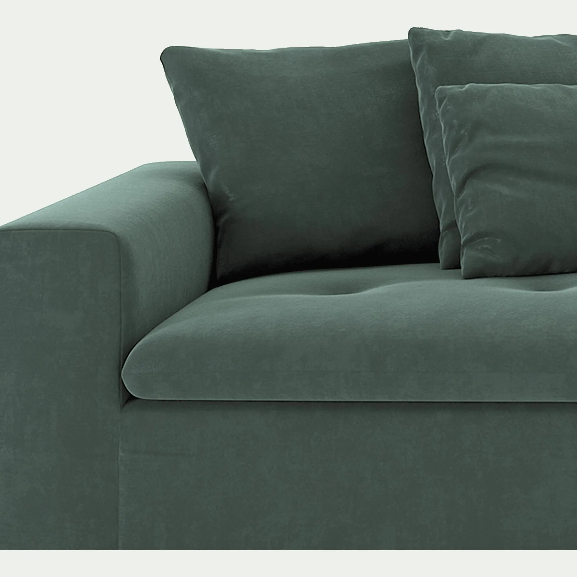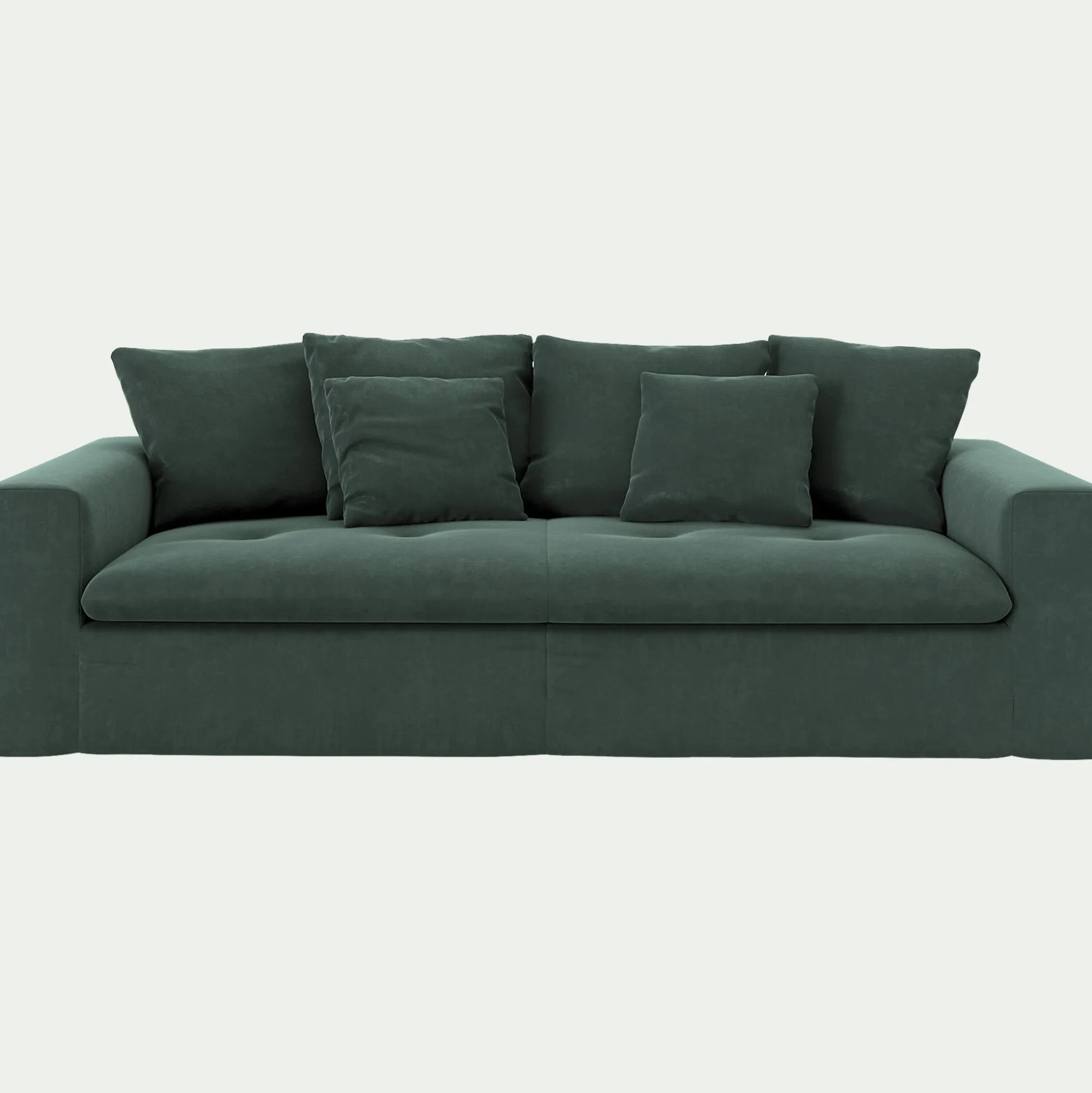 Laissez vous séduire par le charme du canapé Elea, un meuble pensé pour sublimer votre salon. Ce canapé 4 places fixe allie à la fois esthétisme et confort, pour un espace de vie chaleureux. Son dossier à l’accueil plume vous procure une sensation de bien-être douillet alors que sa profonde assise vous donne une impression cocooning d’enveloppement. Ses coussins de dossier, soigneusement jetés, accentuent son aspect accueillant tout en apportant une touche de décoration raffinée. Son surmatelas délicatement intégré confère à l’ensemble une sensation de légèreté fortement appréciable. En ce qui est du design, ses lignes épurées et sa jupe font de lui un atout charme intemporel. Revêtu d’un tissu velours de couleur vert sauge, il vous permet de vous prélasser tout en apportant un côté lumineux et apaisant à votre pièce. Idéal pour la détente ou pour recevoir famille et amis, il incarne à merveille l’équilibre entre sophistication et confort inouï.