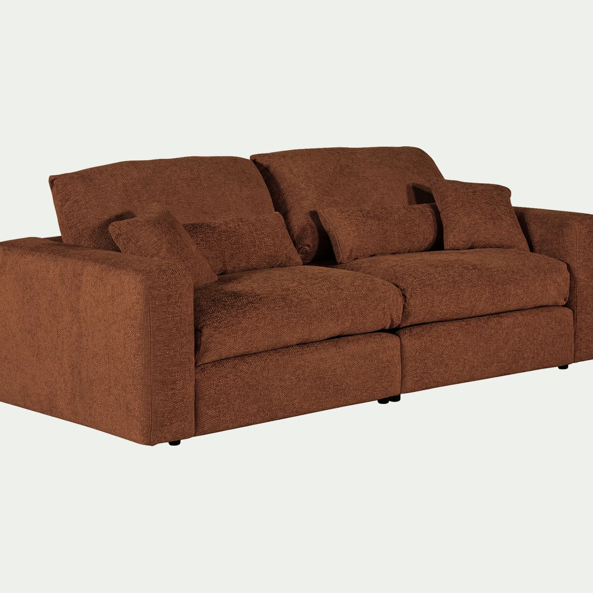 Le canapé Piuma est idéal pour se prélasser dans votre salon. Avec ses grandes assises, ce canapé 5 places fixe en tissu chenille vous offre un confort exceptionnel. Il vous permet de vous détendre au coeur de coussins moelleux qui vous font sentir dans un nuage de douceur, une sensation renforcée par son tissu délicat. Vous pourrez ainsi recevoir famille et amis à partager des soirées conviviales lors d’un moment apaisant. Ce canapé fixe de couleur brun rustrel apporte également une touche design moderne et élégante à votre salon. Son tissu chenille donne un côté cocooning qui vous permet de transformer votre pièce en un espace chaleureux. Piuma fait ainsi rimer confort avec esthétisme et élégance.
