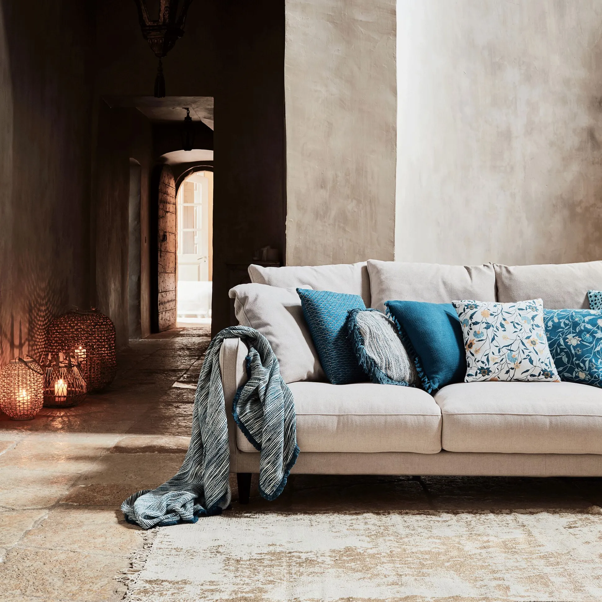 Revêtement : Tissu joint 100% polyester. 4 coussins 60x60cm et 3 coussins 50x50cm garnis de plumes d’oies et de fibres polyester.