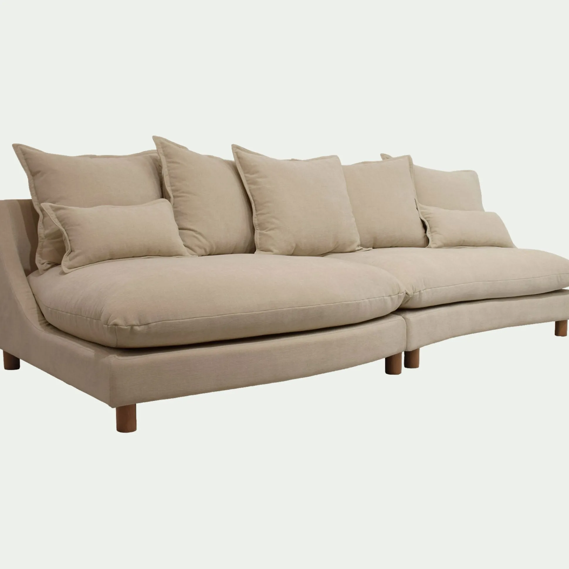 Ce grand canapé modulable séduit par ses lignes généreuses et son design singulier, entre modernité et confort. Entièrement convertible, il se compose de deux modules que l’on peut rapprocher pour former un lit d’appoint, idéal pour les moments de détente prolongés. Revêtu d’un tissu beige, il apporte de la lumière, de la douceur et ainsi participe à une atmosphère apaisante. Ses nombreux coussins renforcent l’esprit cocooning et invitent à s’y lover. Fabriqué en France, dans des ateliers situés près de Bourges, ce canapé reflète le savoir-faire d’artisans passionnés. Une pièce de caractère, conçue avec soin, qui incarne l’élégance à la française.