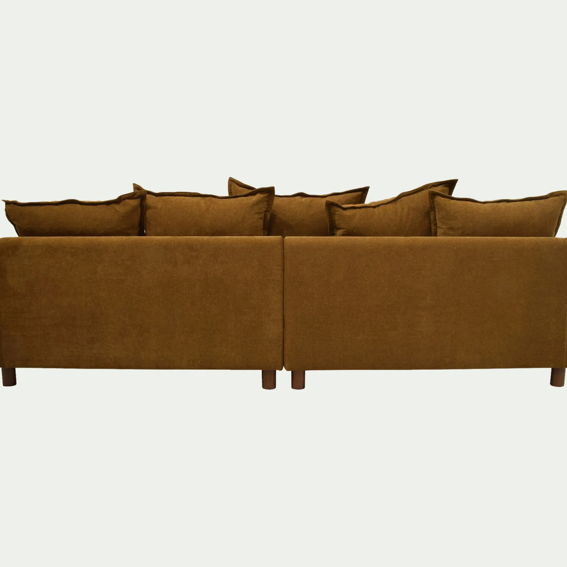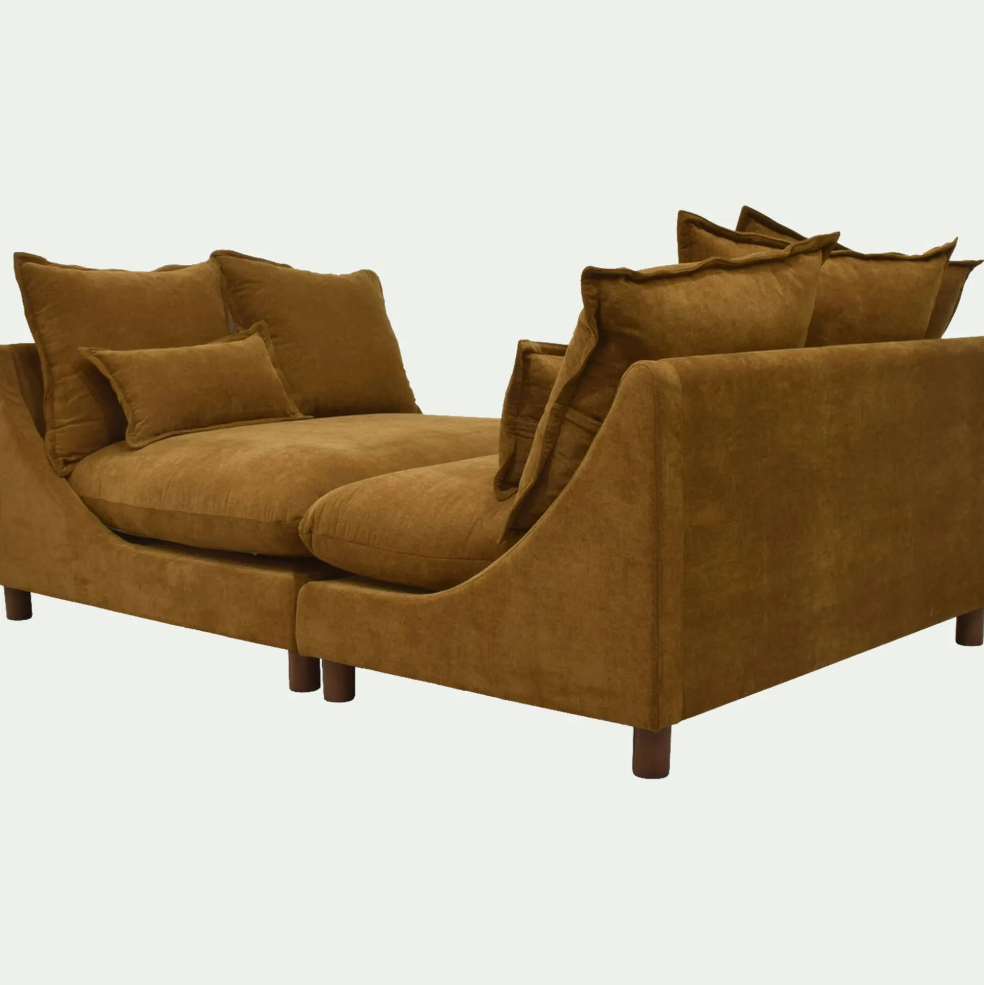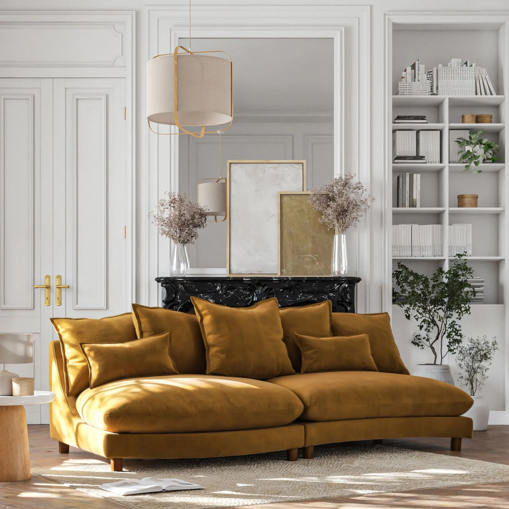 Ce grand canapé modulable séduit par ses lignes généreuses et son design singulier, entre modernité et confort. Entièrement convertible, il se compose de deux modules que l’on peut rapprocher pour former un couchage d’appoint, idéal pour les moments de détente prolongés. Revêtu d’un tissu bronze, il apporte une touche chaleureuse et précieuse à l’espace. Ses nombreux coussins renforcent l’esprit cocooning et invitent à s’y lover. Fabriqué en France, dans des ateliers situés près de Bourges, ce canapé reflète le savoir-faire d’artisans passionnés. Une pièce de caractère, conçue avec soin, qui incarne l’élégance à la française.