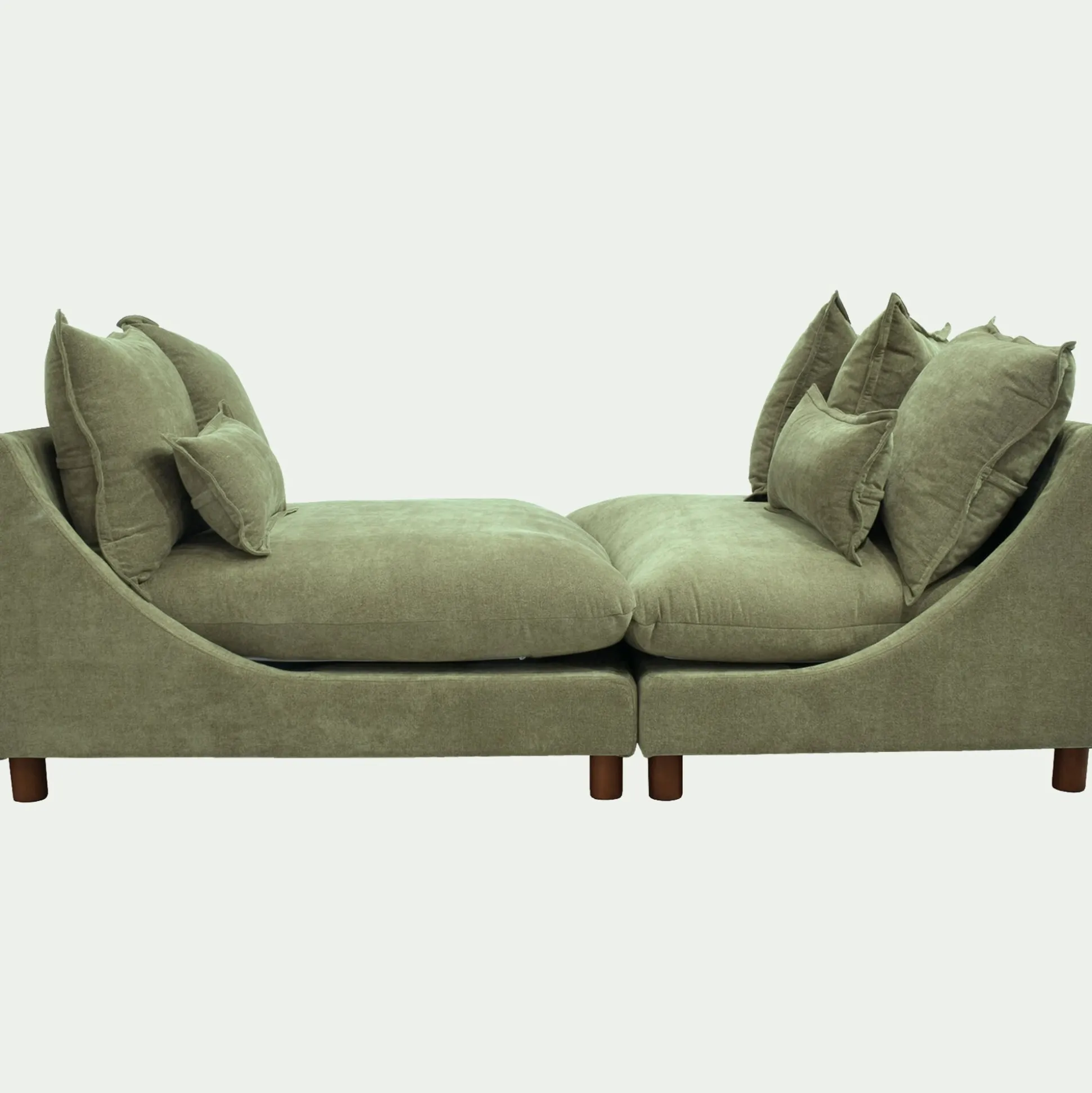 Ce grand canapé modulable séduit par ses lignes généreuses et son design singulier, entre modernité et confort. Entièrement convertible, il se compose de deux modules que l’on peut rapprocher pour former un couchage d’appoint, idéal pour les moments de détente prolongés. Revêtu d’un tissu vert eucalyptus, il apporte une note de fraîcheur douce et naturelle à la pièce. Ses nombreux coussins renforcent l’esprit cocooning et invitent à s’y lover. Fabriqué en France, dans des ateliers situés près de Bourges, ce canapé reflète le savoir-faire d’artisans passionnés. Une pièce de caractère, conçue avec soin, qui incarne l’élégance à la française.