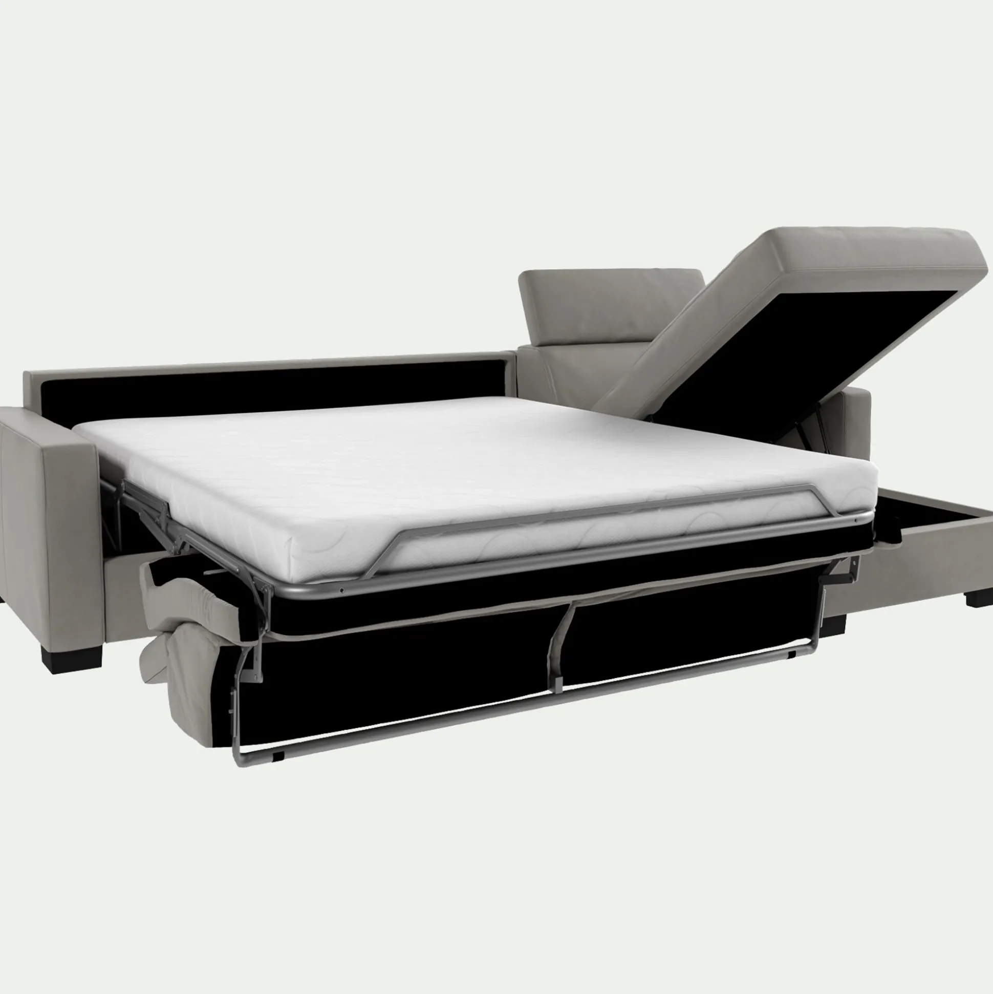 Mauro est une gamme de canapés au style contemporain et d’une grande élégance pour décorer votre salon. Conçu en Italie, il est le fruit d’un travail minutieux et d’un savoir-faire unique. Ce canapé d’angle en cuir couleur Gris borie, arborant de larges accoudoirs de 15 cm et des têtières relevables, vous procure un confort d’assise incomparable et vous invite à savourer d’agréables moments de détente. Avec sa fonction convertible, vous pourrez le transformer en un confortable couchage afin d’accueillir famille et amis. Un meuble de fabrication européenne qui sera la pièce maîtresse de votre salon et sublimera votre décoration d’intérieur.