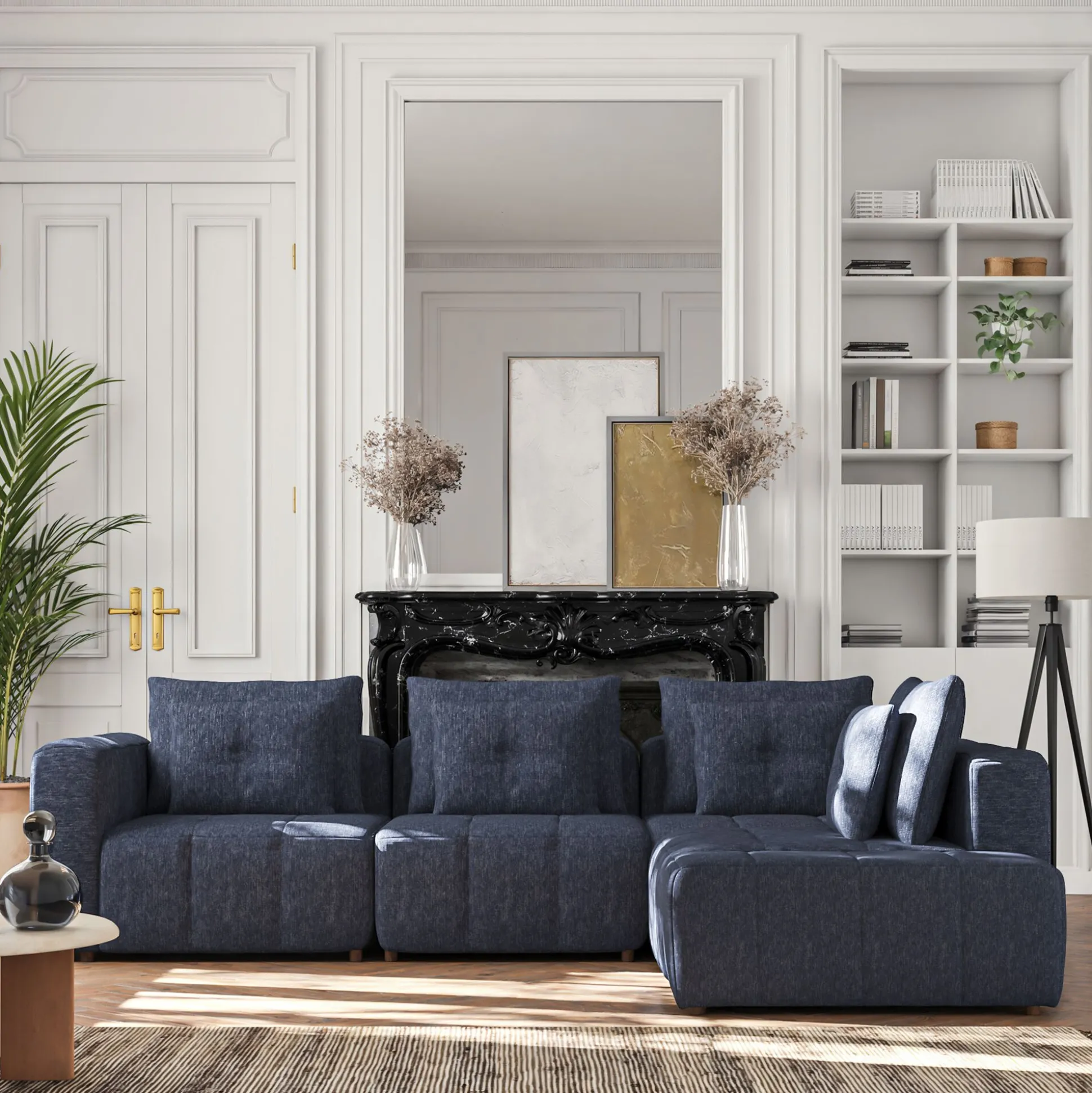 Optez pour le confort et la qualité avec ce canapé d’angle droit en tissu Benjo, fabriqué en Belgique. Son coloris bleu marine, lumineux et intemporel, crée une ambiance apaisante dans votre salon. Son pouf modulable vous offre une flexibilité totale pour vous détendre et accueillir vos proches, tout en profitant du savoir-faire belge.