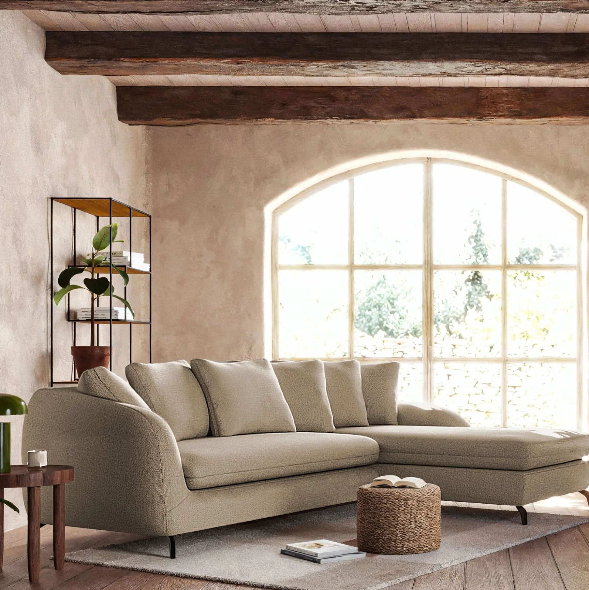 Un joli canapé d’angle droit en tissu pour profiter agréablement de votre salon. Un look contemporain et accueillant, sublimé par un piétement original en acier noir. Vous apprécierez la forme du dossier et des accoudoirs qui vous offrent un maintien optimal de votre dos pour un confort d’assise exceptionnel. Un canapé fabriqué en France, dans des ateliers proches de la ville de Bourge, qui incarne l’excellence du savoir-faire français. Un coloris beige qui apporte une note citadine et raffinée à votre décoration de salon.