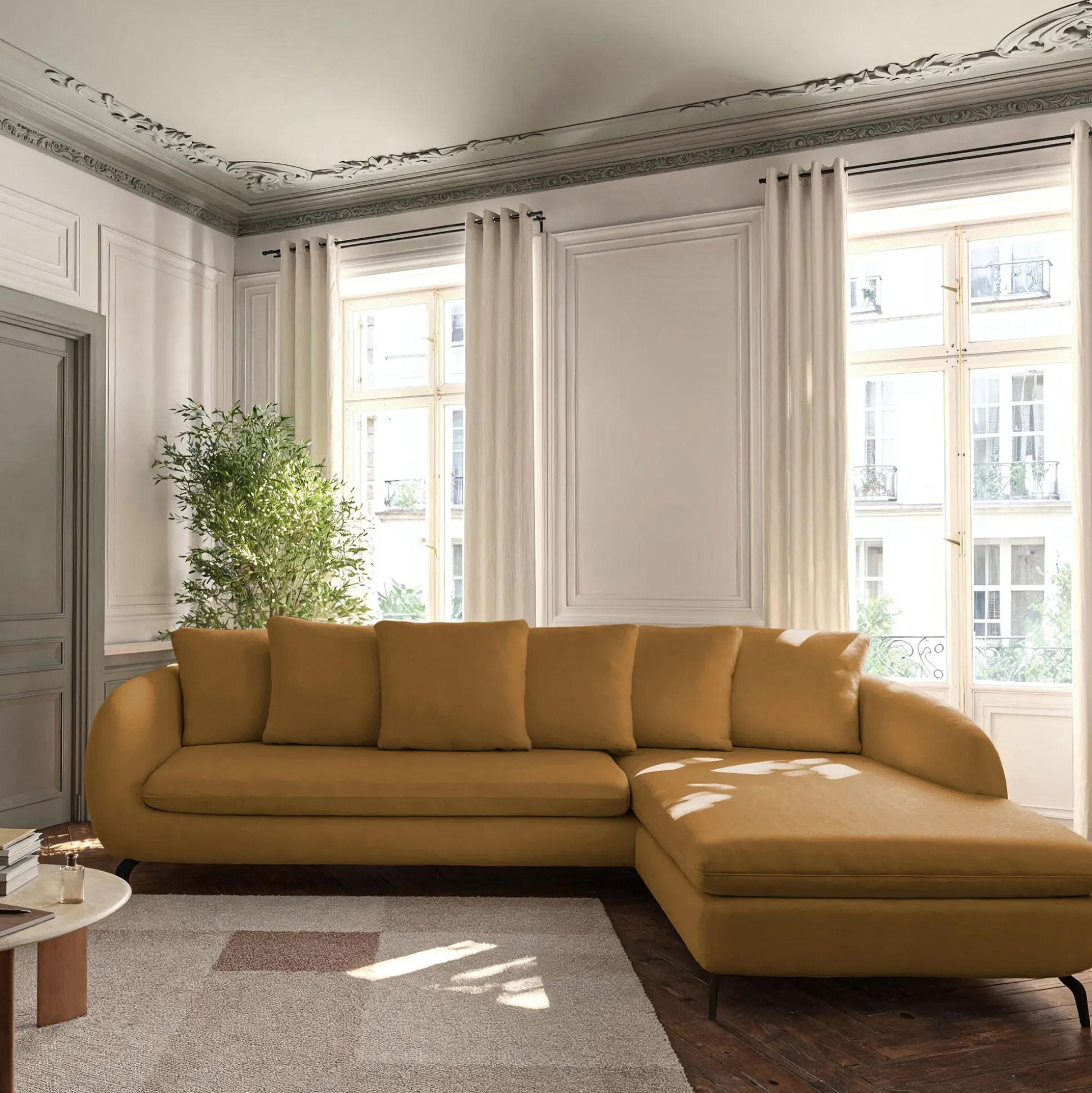 Un joli canapé d’angle droit en tissu pour profiter agréablement de votre salon. Un look contemporain et accueillant, sublimé par un piétement original en acier noir. Vous apprécierez la forme du dossier et des accoudoirs qui vous offrent un maintien optimal de votre dos pour un confort d’assise exceptionnel. Un canapé fabriqué en France, dans des ateliers proches de la ville de Bourge, qui incarne l’excellence du savoir-faire français. Un coloris bronze qui apporte une note citadine et raffinée à votre décoration de salon.