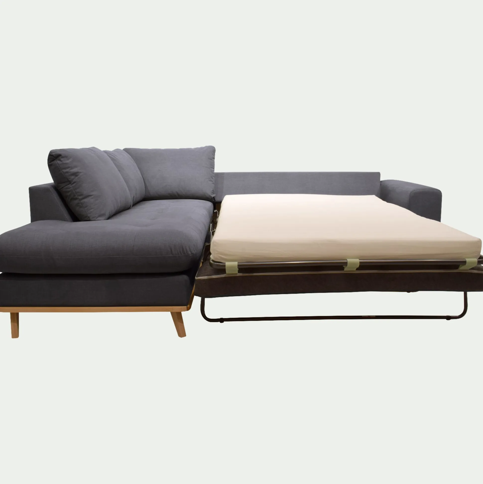 Le canapé d’angle convertible Capia allie confort, style et praticité. De jour, il offre une assise spacieuse pour 5 personnes grâce à son angle à gauche. Ce canapé est alors revêtu d’un tissu Cosmo dans notre coloris gris anthracite, chci et indémodable. Son tissage résistant apporte douceur et durabilité, parfait pour une utilisation quotidienne. Le soir, il se transforme en un couchage d’appoint de 120×190 cm grâce à un mécanisme d’ouverture rapide et facile, intégrant un sommier et un matelas pour un confort optimal. Son design repose sur une structure en pin massif et des pieds en hêtre massif, gage de solidité et de durabilité. Les coussins de dos déhoussables facilitent l’entretien. Une fabrication française qui conjugue esthétique et fonctionnalité.