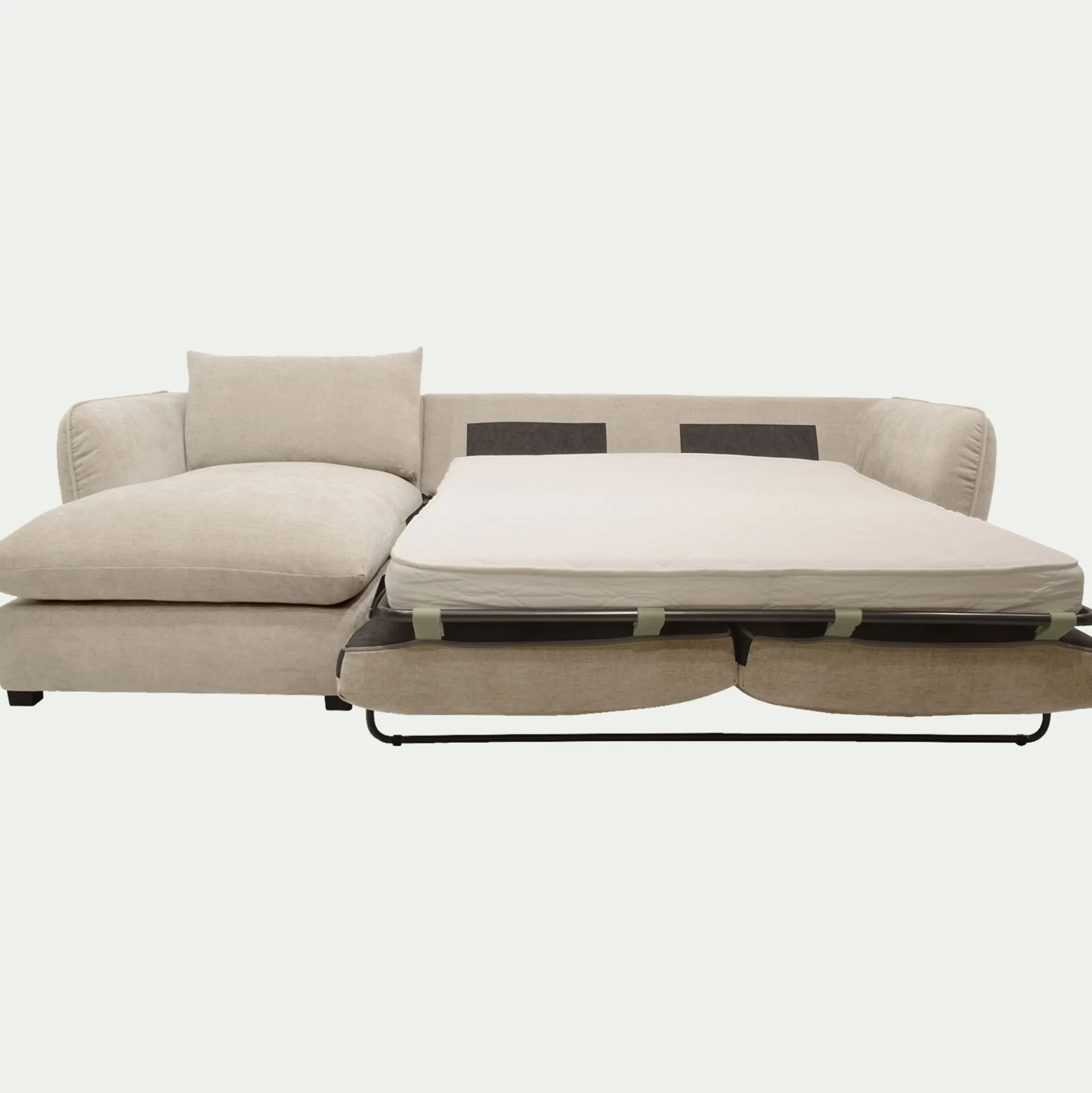 De jour comme de nuit, ce canapé d’angle convertible avec angle à gauche s’adapte à toutes les envies. Avec son tissu blanc écru, il adoucit le salon et lui insuffle une atmosphère cocooning et un style bohème. Son assise profonde et sa méridienne invitent à la détente, offrant un confort idéal pour les moments de repos ou de convivialité. Son design généreux et cosy en fait une pièce maîtresse qui réchauffe l’espace avec élégance. Et lorsque l’heure du coucher approche, ce canapé d’angle se transforme en couchage occasionnel en un clin d’œil. Grâce à son système express, il suffit de tirer pour dévoiler un sommier avec matelas de 140×190 cm, prêt à accueillir les invités pour la nuit. Plus qu’un simple canapé en tissu, c’est un véritable allié du quotidien, alliant style et fonctionnalité sans compromis.