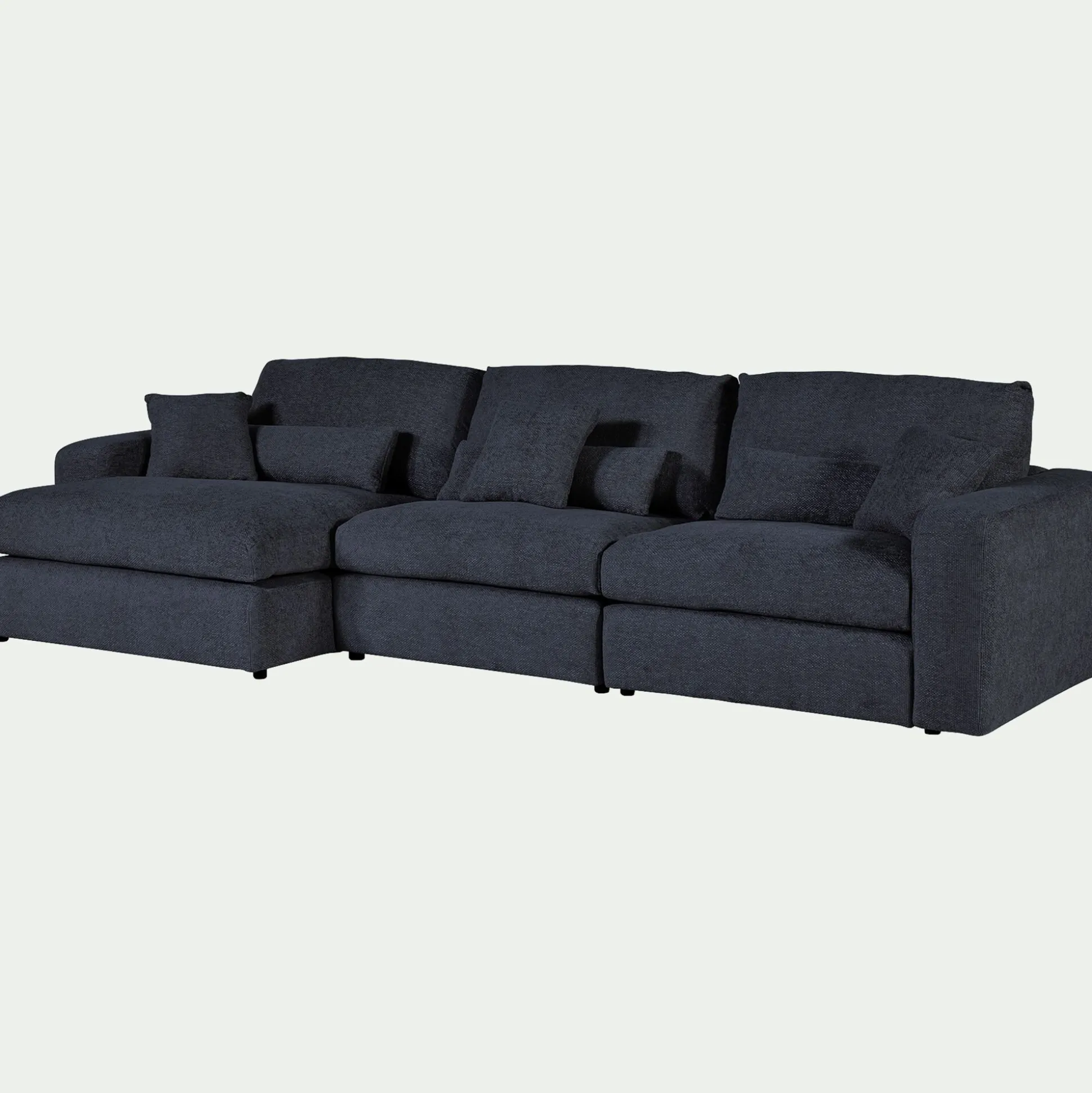 Avec son format généreux 5 places et son angle à gauche, ce canapé d’angle est une invitation aux moments partagés. Son revêtement en tissu chenille, à la fois doux et résistant, enveloppe l’espace d’une chaleur réconfortante. Son coloris bleu marine, intemporel, s’harmonise avec tous les styles d’intérieur. Pensé pour le confort, ce canapé fixe se compose d’une assise spacieuse, d’un dossier accueillant et de coussins déhoussables pour un entretien facilité. Six coussins décoratifs viennent parfaire l’ensemble, ajoutant une touche cosy. Un canapé idéal pour des instants de détente en famille ou entre amis.