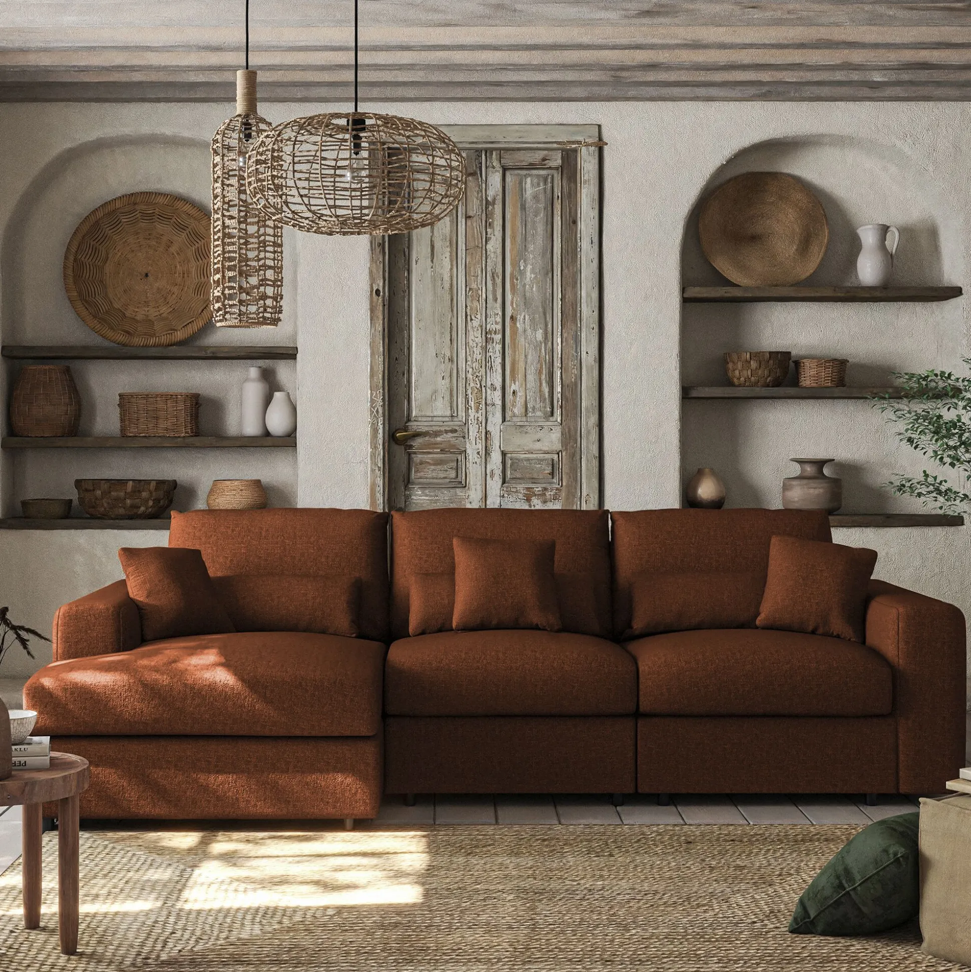 Avec son format généreux 5 places et son angle à gauche, ce canapé d’angle est une invitation aux moments partagés. Son revêtement en tissu chenille, à la fois doux et résistant, enveloppe l’espace d’une chaleur réconfortante. Son coloris brun rustrel, intemporel, s’harmonise avec tous les styles d’intérieur. Pensé pour le confort, ce canapé fixe se compose d’une assise spacieuse, d’un dossier accueillant et de coussins déhoussables pour un entretien facilité. Six coussins décoratifs viennent parfaire l’ensemble, ajoutant une touche cosy. Un canapé idéal pour des instants de détente en famille ou entre amis.