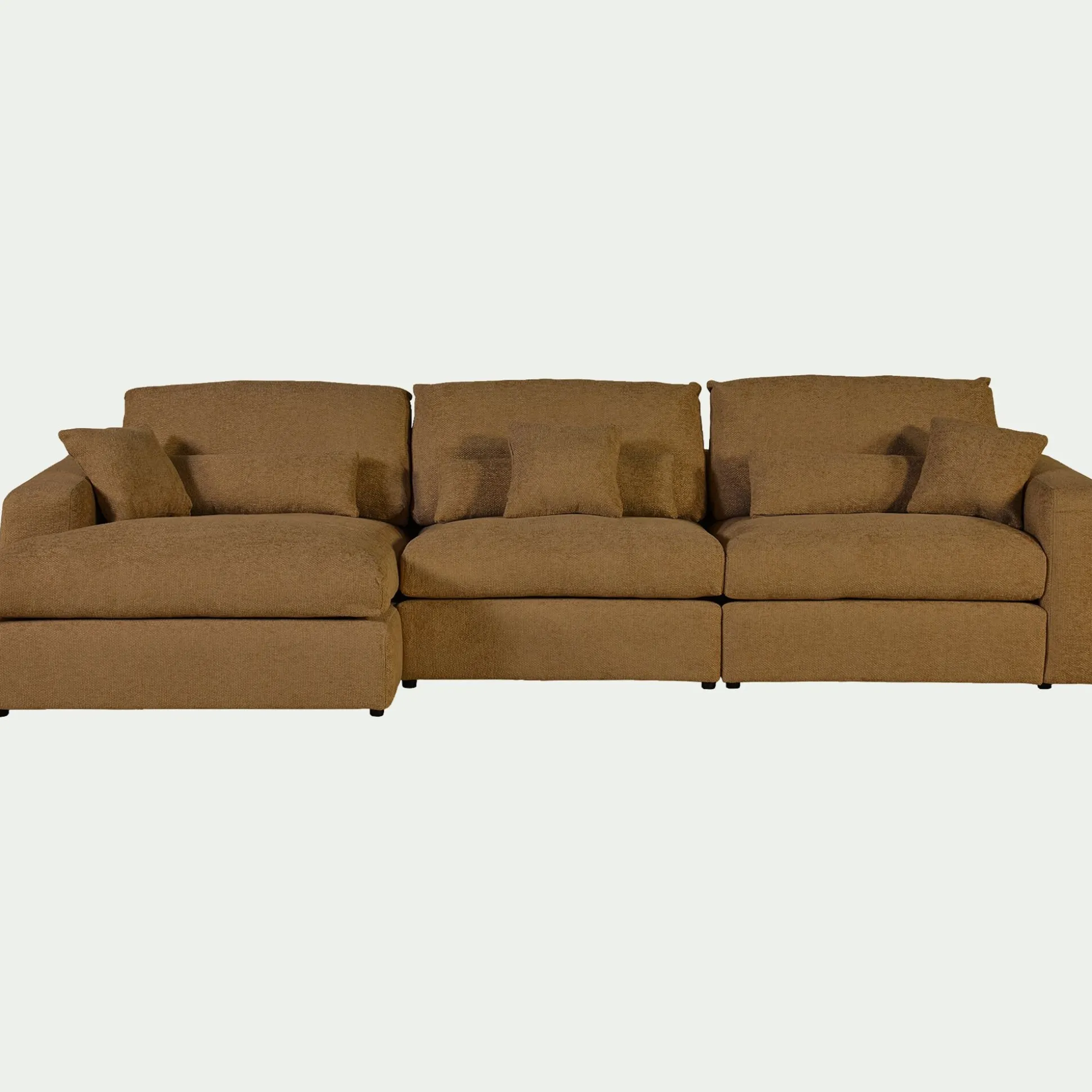 Avec son format généreux 5 places et son angle à gauche, ce canapé d’angle est une invitation aux moments partagés. Son revêtement en tissu chenille, à la fois doux et résistant, enveloppe l’espace d’une chaleur réconfortante. Son coloris jaune argan, intemporel, s’harmonise avec tous les styles d’intérieur. Pensé pour le confort, ce canapé fixe se compose d’une assise spacieuse, d’un dossier accueillant et de coussins déhoussables pour un entretien facilité. Six coussins décoratifs viennent parfaire l’ensemble, ajoutant une touche cosy. Un canapé idéal pour des instants de détente en famille ou entre amis.