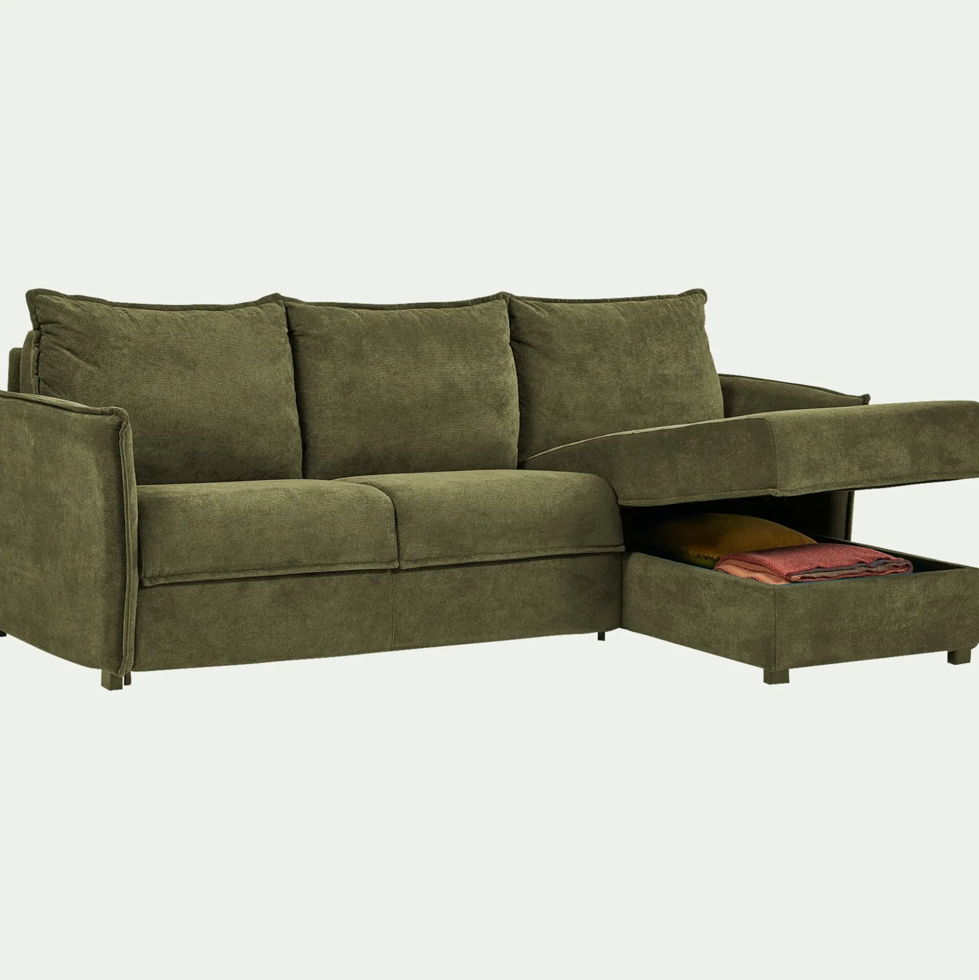 Le canapé Moya offre un soutien optimal adapté à chaque partie du corps. Ce canapé d’angle convertible à la fabrication italienne, confectionné à partir du savoir faire local, vous permet de vous détendre dans une pièce hautement qualitative. Le soir, dépliez votre canapé et transformez-le en un lit au couchage 140×195 cm d’une densité de 35kg/m3 qui vous permettra d’accueillir famille et amis. Très confortable, ce canapé peut servir de couchage quotidien. Son mécanisme métallique vous permet de le déplier en quelques secondes sans enlever ses coussins. Ce canapé en tissu, avec sa couleur vert cèdre et son liseré décoratif, apportera de l’élégance à votre salon.