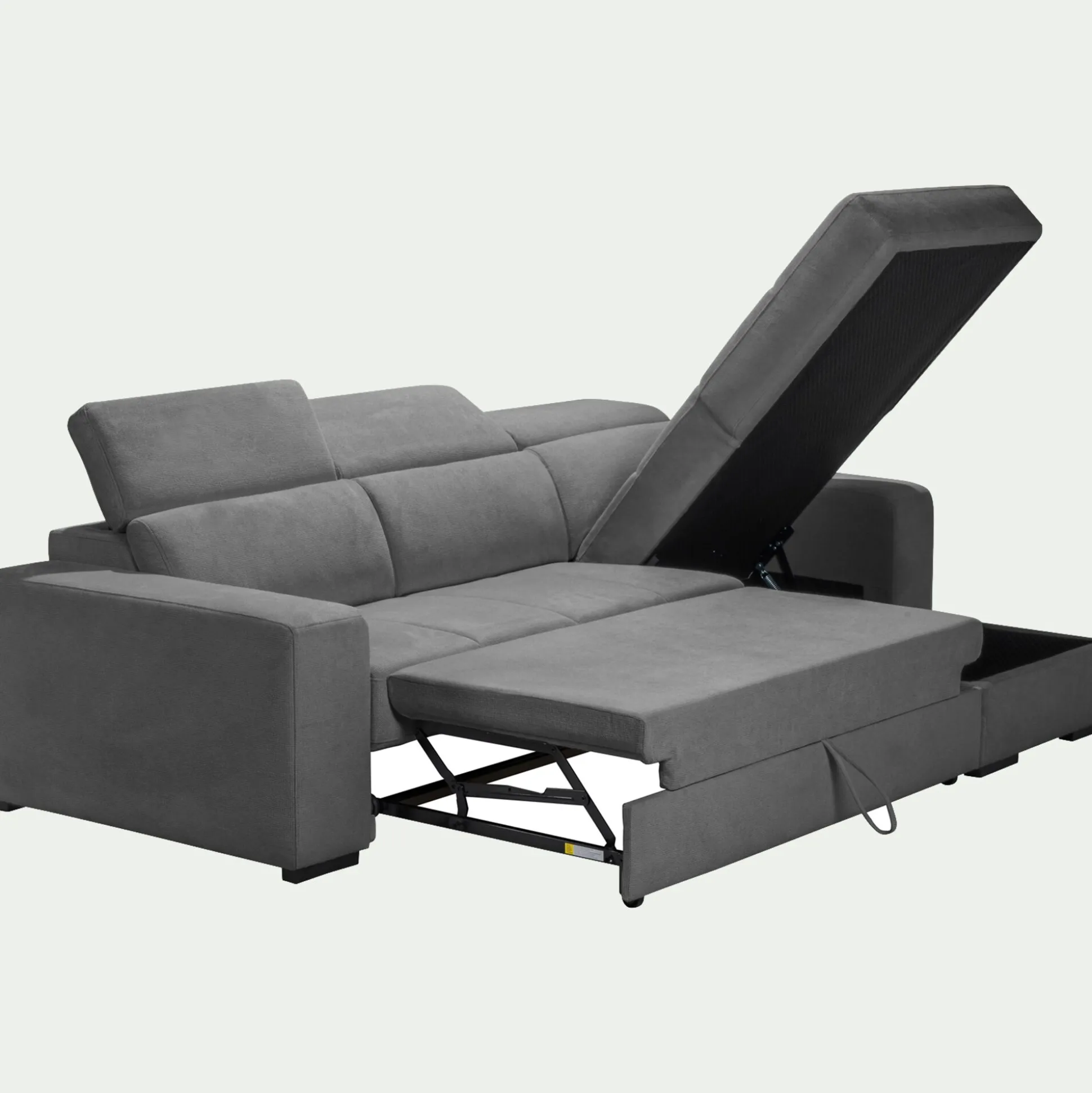 Un superbe canapé d’angle réversible en tissu d’un coloris gris moyen, idéal pour un grand salon. Ce canapé vous offre un espace détente spacieux et confortable avec son assise capitonnée et ses têtières relevables qui accompagneront tous vos mouvements. Convertible, il met à votre disposition un couchage occasionnel de 130×200 cm. Pratique et astucieux, ce grand canapé vous propose également un coffre de rangement sous la méridienne. Vous avez ainsi un espace de rangement supplémentaire à disposition pour mettre vos plaids et coussins de façon pratique. Optez sans hésiter pour ce canapé qui allie fonctionnalité, style et confort.
