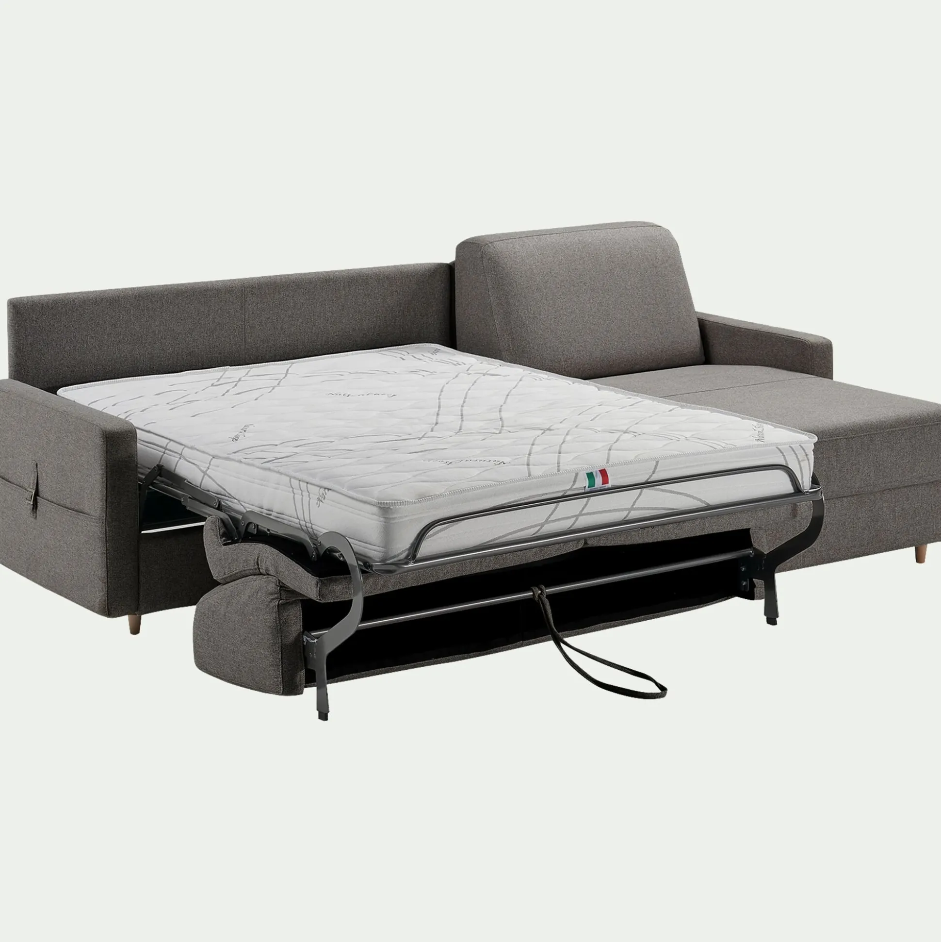 Le canapé Gaya est non seulement un meuble de qualité, mais aussi un bel élément de déco pour votre intérieur. Ce canapé d’angle de fabrication italienne, confectionné à partir d’un savoir-faire unique, allie charme et praticité, et saura trouver sa place dans votre salon. En effet, c’est un canapé convertible doté d’un lit en 140×195 cm très confortable, adapté pour un couchage quotidien d’une densité de 35kg/m3. Son mécanisme métallique vous permet de le déplier en quelques secondes sans enlever ses coussins. Ce canapé droit en tissu gris offre un soutien optimal adapté à chaque partie du corps.