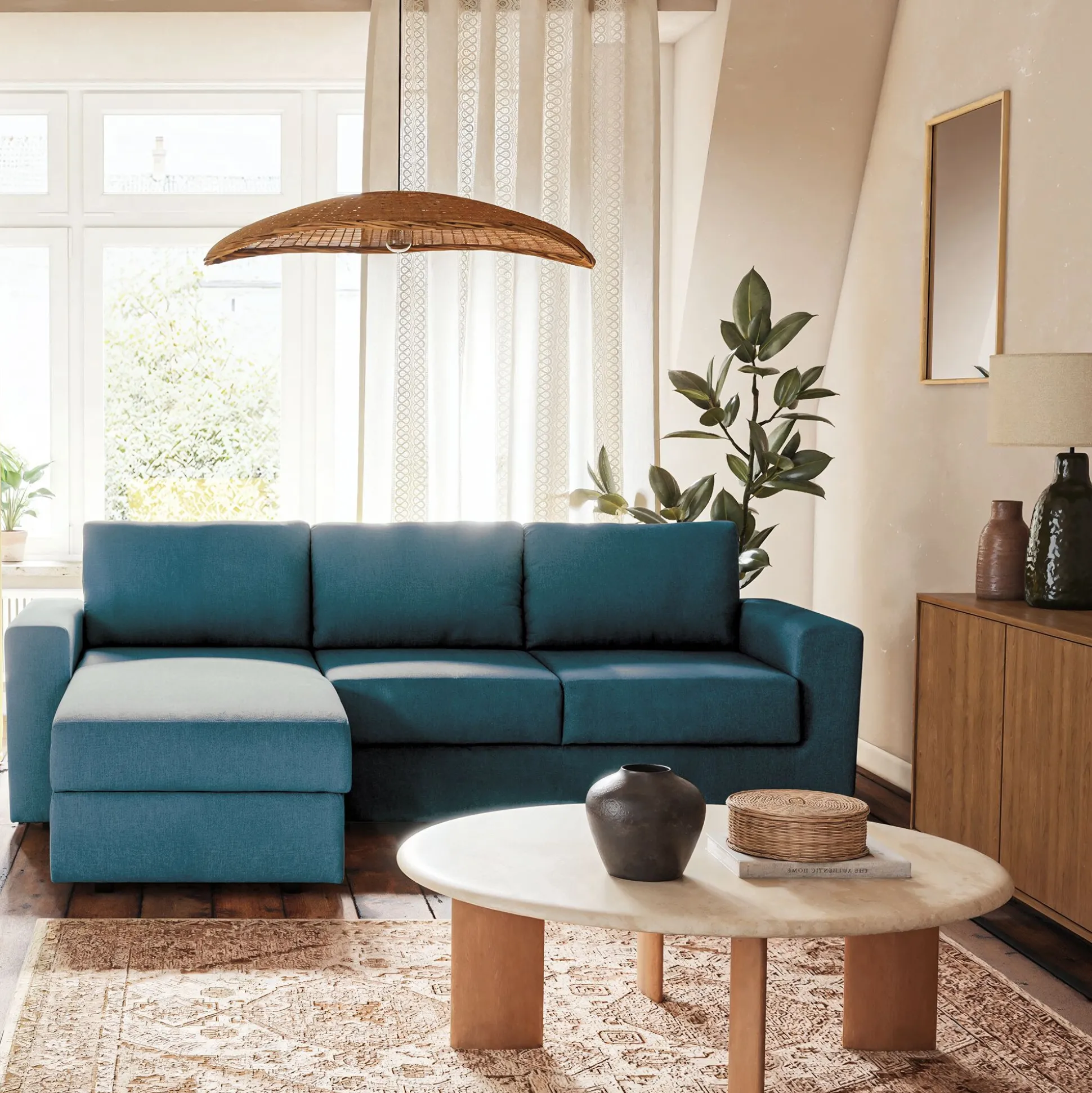 Ce canapé bleu arbore un coloris emblématique de notre palette méditerranéenne : le bleu figuerolles. Il rend ainsi hommage à notre belle région mais plus globalement au savoir-faire français grâce à sa fabrication locale. Le bleu est une couleur apaisante qui saura adoucir la décoration de votre salon tout en lui donnant du peps. Au-delà d’être un meuble décoratif, le canapé Honore présente de nombreuses caractéristiques pratiques. Ce canapé 4 places en tissu arbore une grande méridienne aux multiples visages. C’est tout d’abord un atout confort pour les soirées à la maison, mais aussi un espace de rangement bien dissimulé. En effet, la méridienne cache un coffre de rangement, parfait pour désencombrer votre salon. La méridienne de ce canapé d’angle est réversible : elle se place à droite ou à gauche du canapé selon votre aménagement. Enfin, c’est un canapé d’angle convertible. En un seul geste, un couchage de 140×200 cm fait son apparition et permet d’accueillir vos invités le temps d’une ou plusieurs nuits.