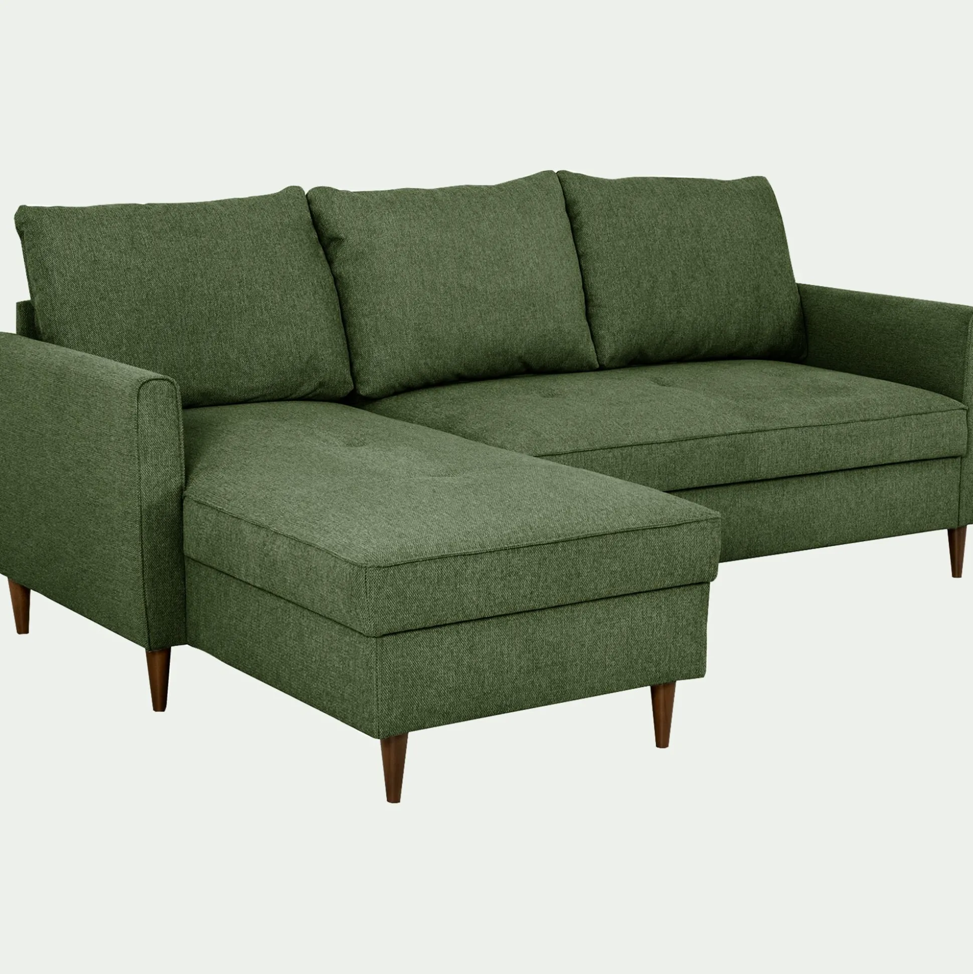 Pensé pour s’adapter à chaque intérieur, ce canapé d’angle réversible permet de choisir l’orientation de son angle, à gauche ou à droite, selon les envies et l’agencement de la pièce. Sa structure en bois accueille une assise en mousse généreuse, complétée par trois coussins de dos qui offrent un soutien optimal aux lombaires et aux épaules. Son revêtement en tissu tramé vert, à la fois profond et naturel, habille ce canapé d’une élégance intemporelle. Non déhoussable, il repose sur des pieds en bois de hêtre qui renforcent son allure chaleureuse et naturelle. Compact avec ces 192 cm de long, ce canapé d’angle 3 places fabriqué en Roumanie est idéal pour conjuguer style et confort au quotidien, même dans un petit salon.