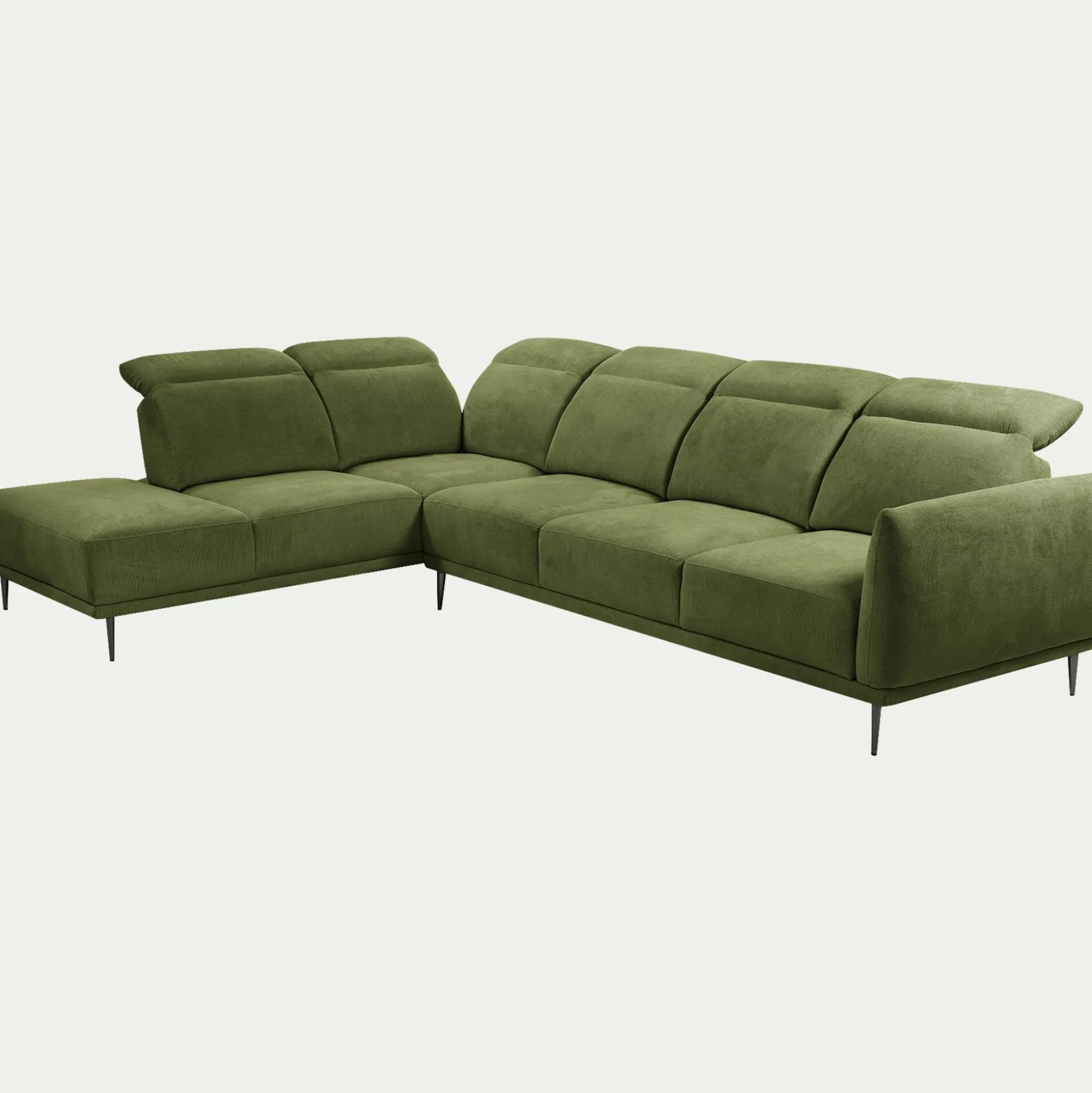 Optez pour ce canapé d’angle gauhe 5 places qui allie un design contemporain à une fonctionnalité ingénieuse. Son revêtement en tissu memphis vert cèdre apporte une touche lumineuse et audacieuse à votre salon. Profitez d’un confort sur mesure grâce à son assise profonde et à son système de dossiers qui reculent pour s’adapter à vos envies. Les têtières relevables offrent un soutien optimal pour vos moments de détente devant la télévision ou un bon livre. Ce canapé est une pièce maîtresse qui séduit par sa qualité de fabrication et son allure résolument moderne.