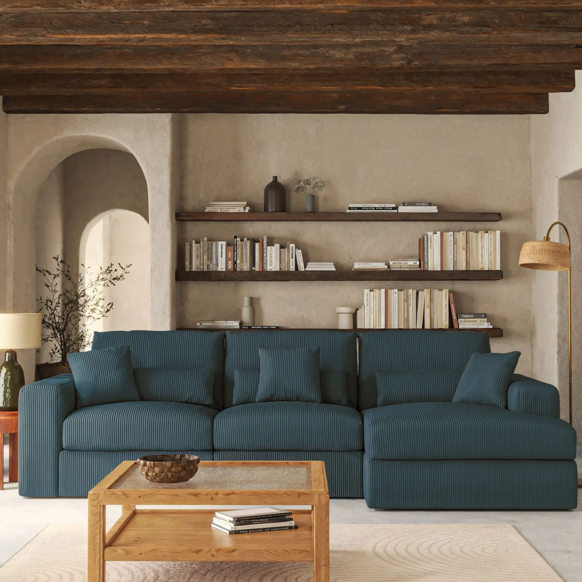 Avec son format 3 places et son angle à droite, ce canapé d’angle est une invitation aux moments partagés. Son revêtement en velours côtelé, à la fois doux et résistant, enveloppe l’espace d’une chaleur réconfortante. Son coloris bleu, intemporel, s’harmonise avec tous les styles d’intérieur. Pensé pour le confort, ce canapé fixe se compose d’une assise spacieuse, d’un dossier accueillant et de coussins déhoussables pour un entretien facilité. Six coussins décoratifs viennent parfaire l’ensemble, ajoutant une touche cosy. Un canapé idéal pour des instants de détente en famille ou entre amis.