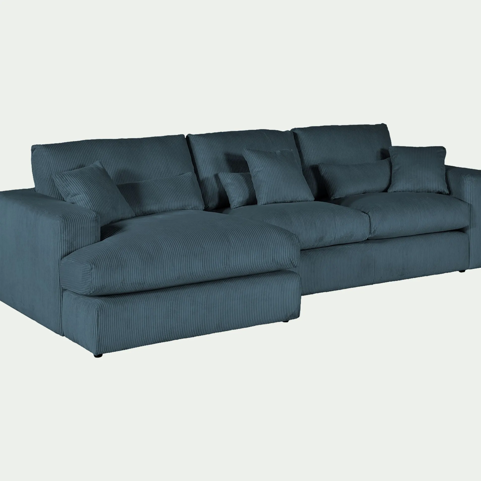 Avec son petit angle à gauche, ce canapé d’angle est une invitation aux moments partagés. Son revêtement en velours côtelé, à la fois doux et résistant, enveloppe l’espace d’une chaleur réconfortante. Son coloris bleu, élégant, s’harmonise avec tous les styles d’intérieur. Pensé pour le confort, ce canapé fixe se compose d’une assise spacieuse, d’un dossier accueillant et de coussins déhoussables pour un entretien facilité. Des coussins décoratifs viennent parfaire l’ensemble, ajoutant une touche cosy. Un canapé idéal pour des instants de détente en famille ou entre amis.