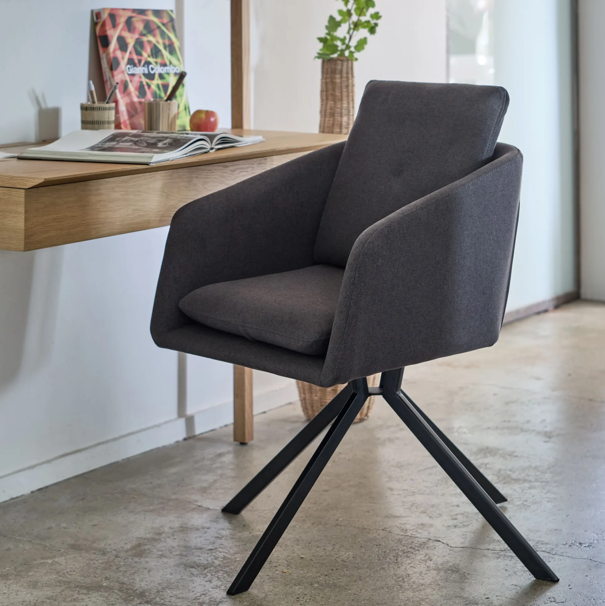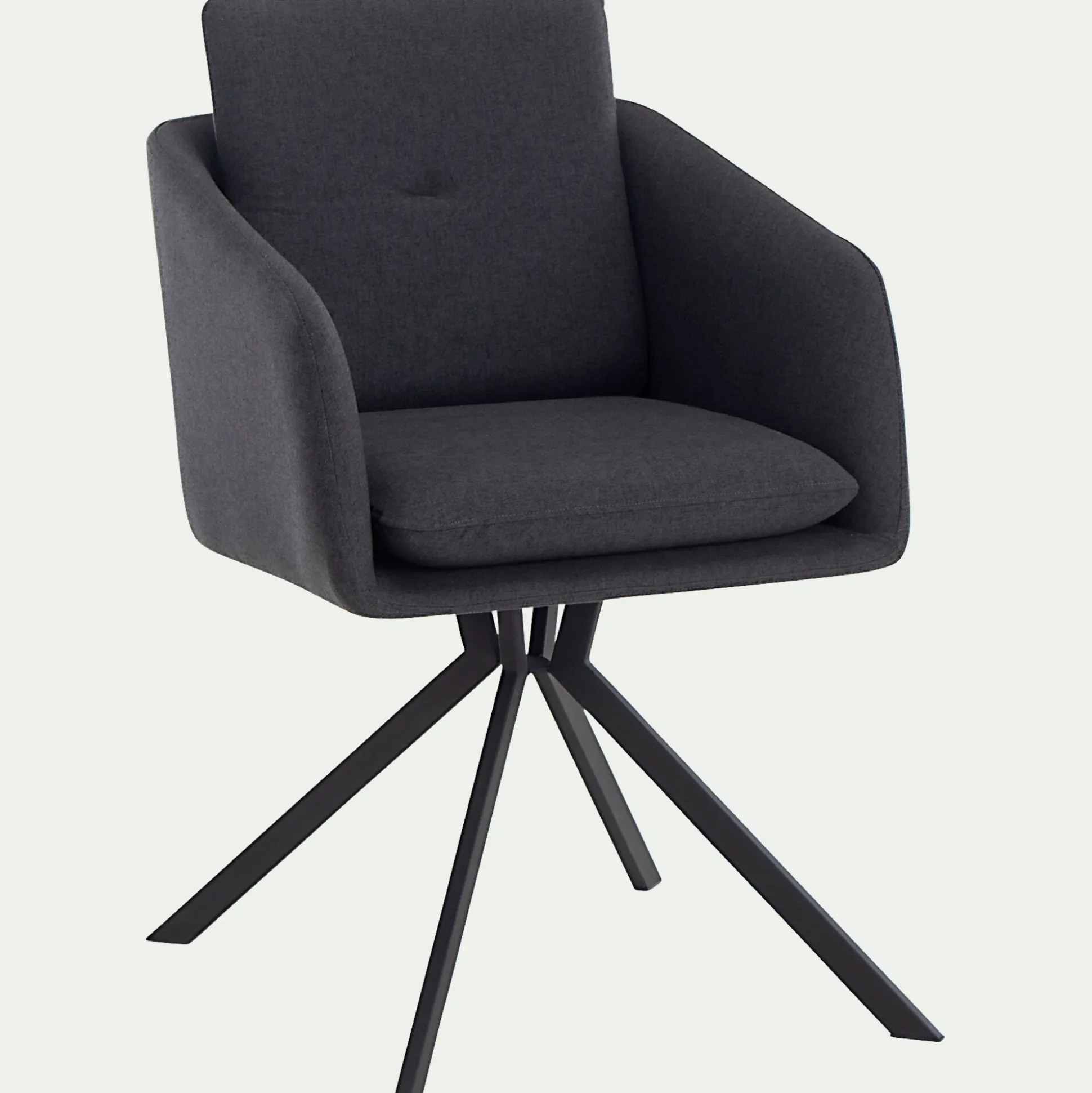 Cette chaise pivotante en tissu trouve sa place idéalement dans votre bureau ou dans la salle à manger et offre une assise confortable et enveloppante grâce à la présence d’accoudoirs. Pivotante, vous serez confortablement installés pour travailler, lire ou écrire. Son coloris noir est élégant et moderne et s’accorde avec le reste de votre décoration et son style épuré ajoute à votre intérieur un côté contemporain.