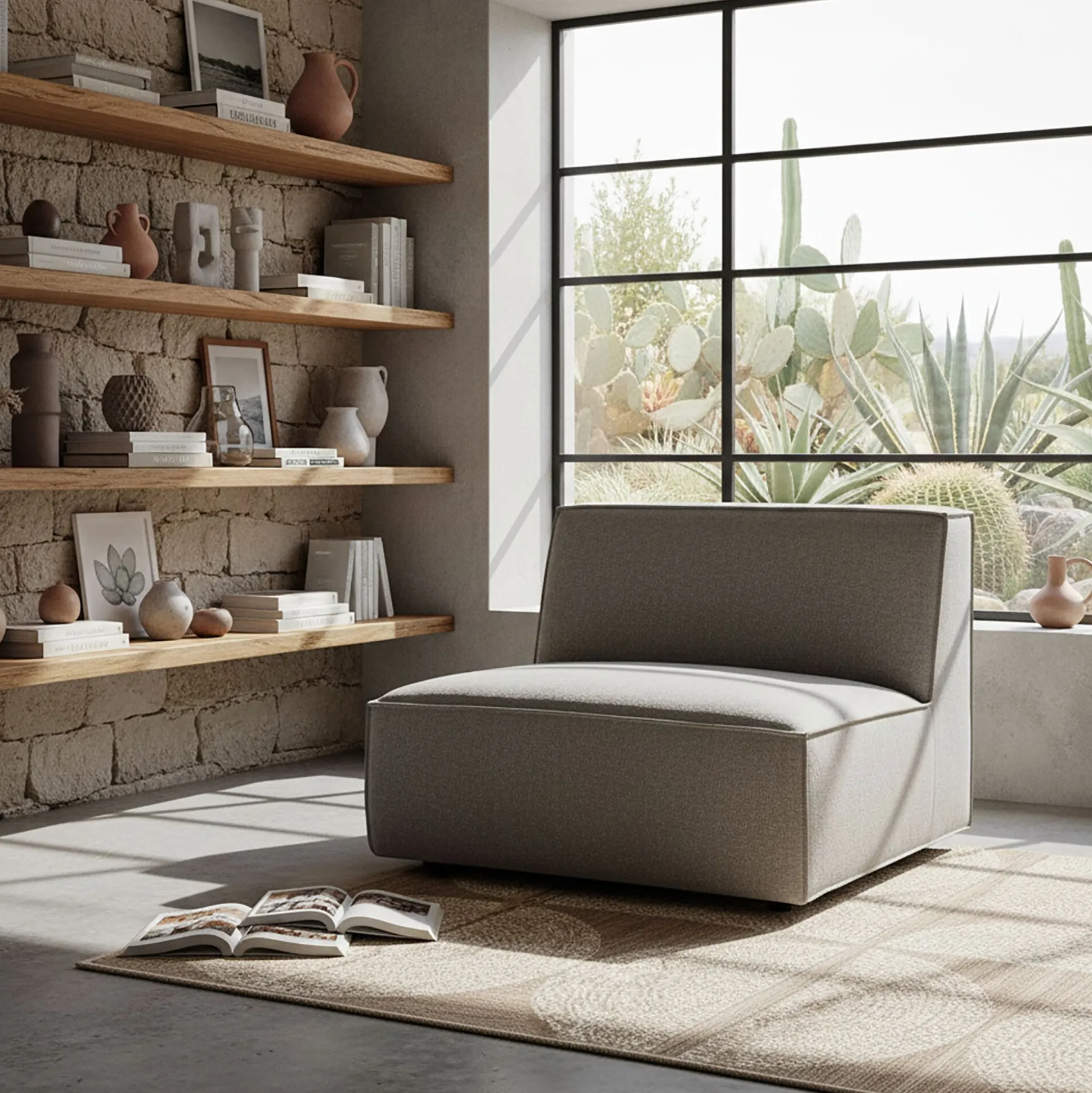 Assise et dossier : assise en mousse polyuréthane densité 28kg/m3 avec ressorts ensachés. Dossier en mousse et flocons de mousse polyuréthane densité 23kg/m3.