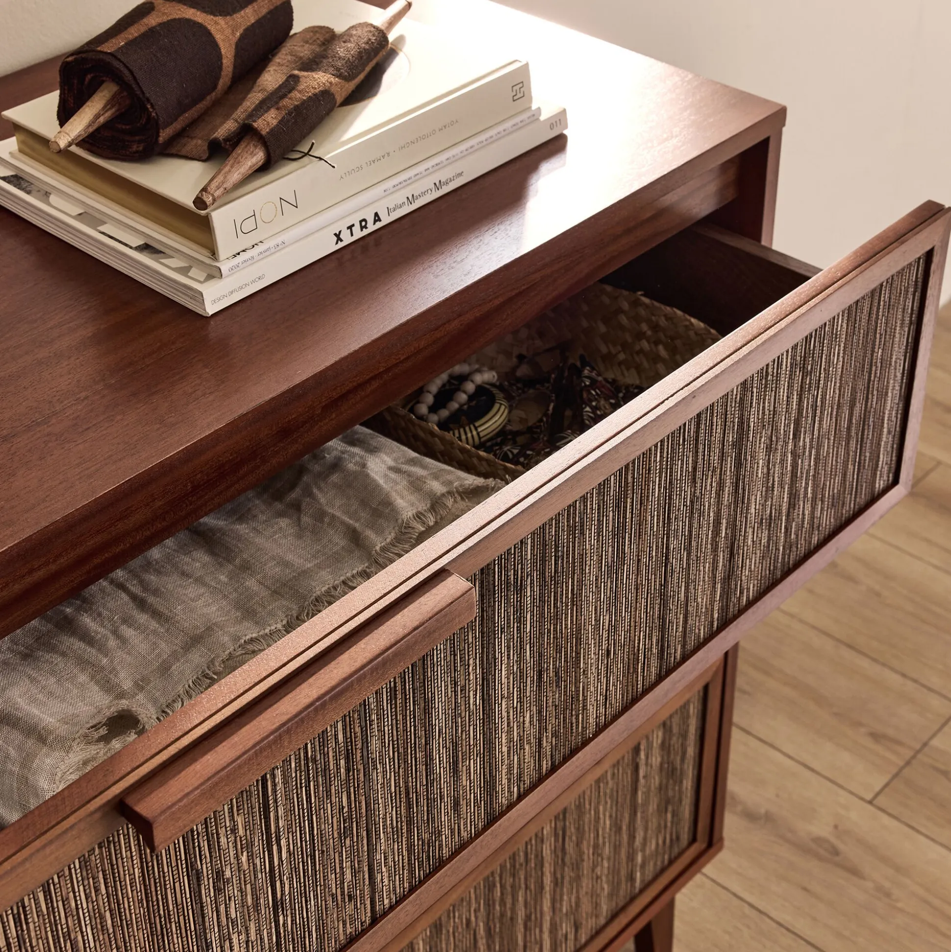 Structure en acajou massif et MDF placage acajou, facade de tiroir recouvert de fibre de Coco, finition vernis cellulosique, pietement bois massif, finition interieure MDF melamine.