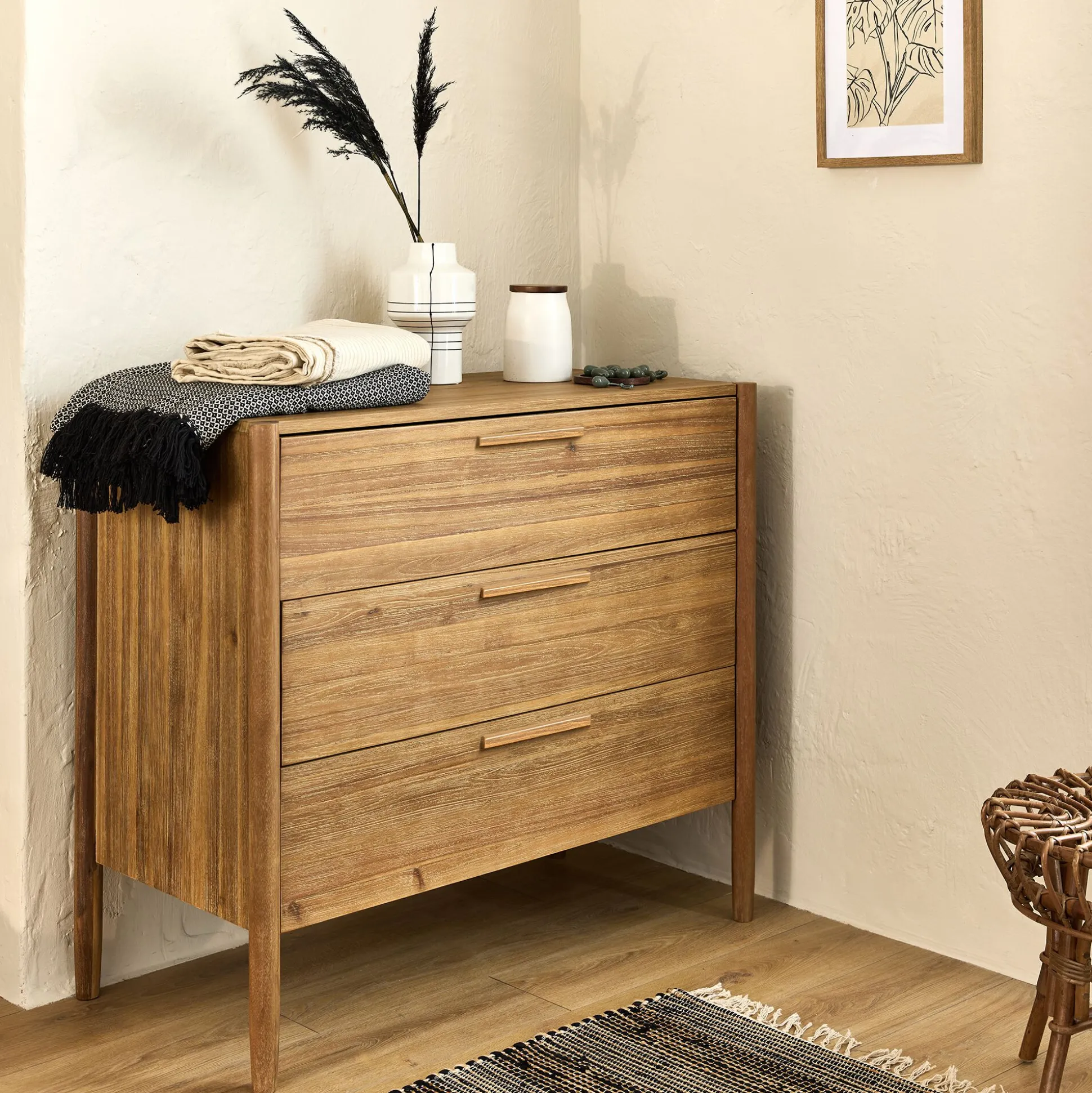 Avec son design sobre et intemporel, la commode 3 tiroirs Emilio en bois d’acacia apporte une touche d’élégance naturelle à votre chambre à coucher. Ses lignes épurées mettent en valeur la richesse du bois et ses nuances uniques, créant ainsi une ambiance chaleureuse et authentique. Dotée de trois tiroirs spacieux, elle offre un espace de rangement fonctionnel pour organiser vos vêtements et accessoires tout en conservant une chambre ordonnée. Son allure raffinée s’intègre parfaitement à tous les styles d’intérieur, du plus contemporain au plus classique. Associez-la aux autres meubles de la gamme Emilio pour une décoration harmonieuse et cohérente.