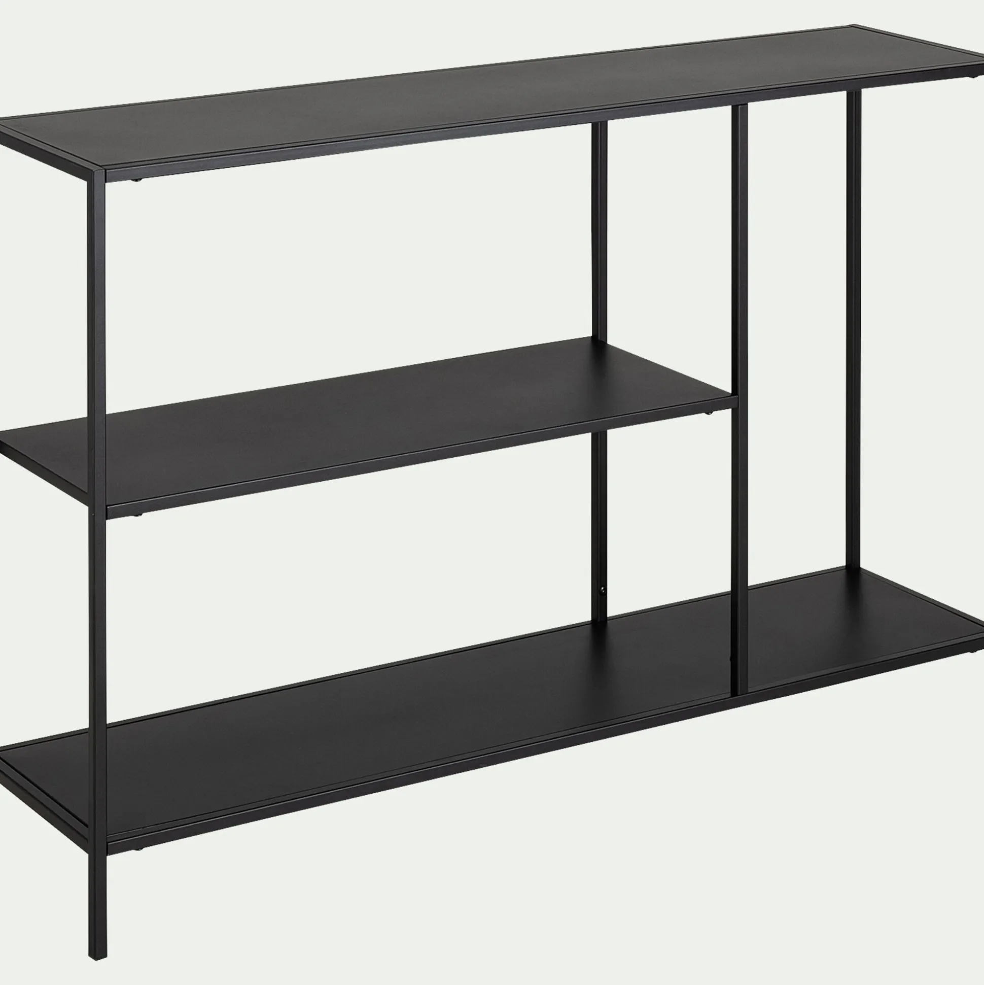 Cette console en acier noir habille votre entrée et permet de l’organiser afin d’optimiser l’espace. Longue mais étroite, elle se place contre le mur et laisse le passage libre. Cette console d’entrée présente trois plateaux différents. La tablette supérieure peut accueillir un vase, une plante, une bougie ou encore un objet déco, afin d’apporter du charme à la pièce. Le second plateau et le plateau inférieur, plus discrets, peuvent servir d’espace de rangement supplémentaire. Enfin, le plateau inférieur est assez grand pour y ranger des paniers ou bien des chaussures. Cette console aux lignes épurées et au design contemporain s’intègrera aisément à la déco de votre intérieur.