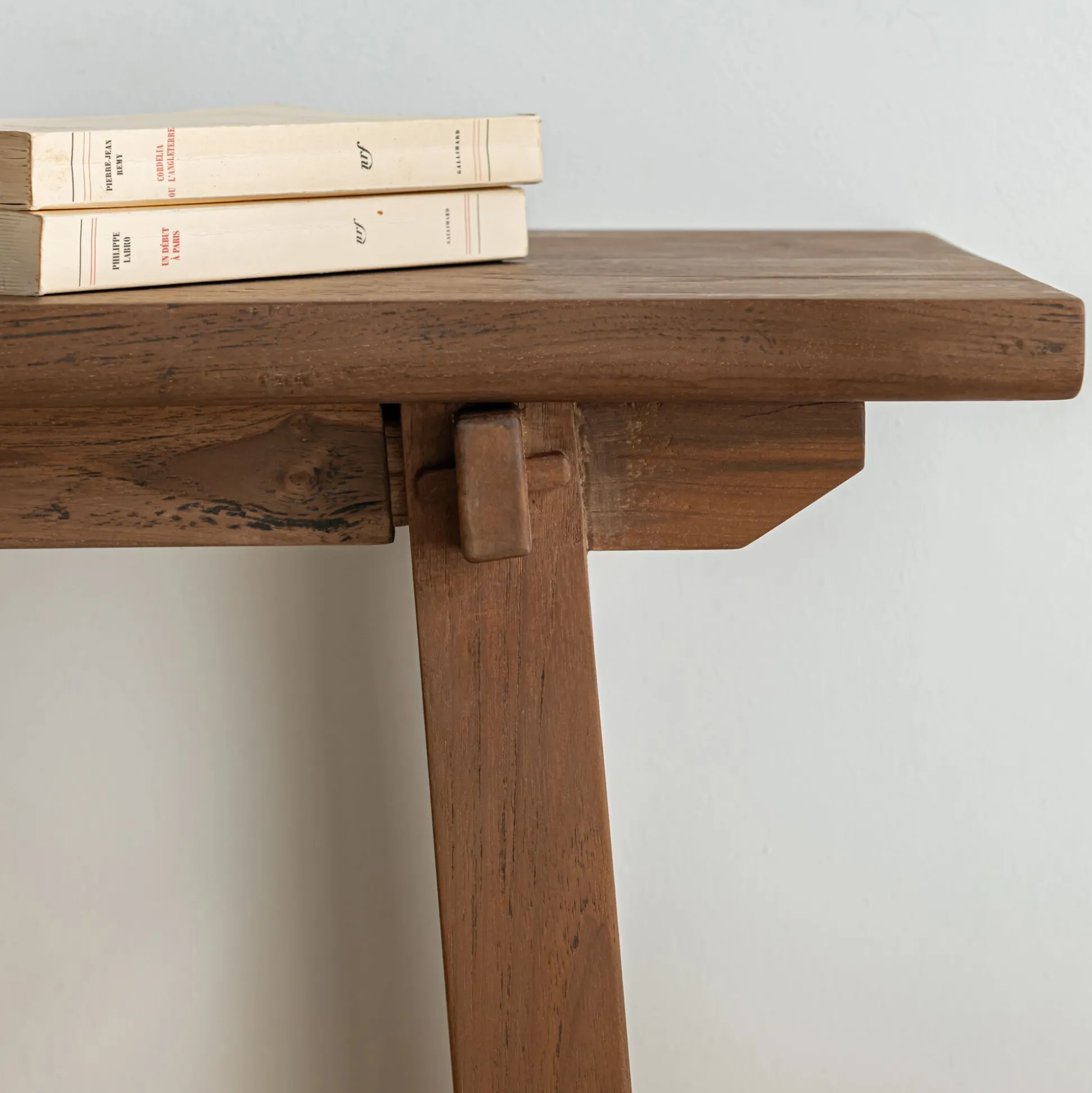 La console Meyrargues allie authenticité et fonctionnalité. Fabriquée en teck recyclé certifié FSC, elle mesure 125 cm de long pour une silhouette étroite, idéale dans une entrée ou un couloir. Son plateau supérieur accueille décorations ou objets du quotidien, tandis que le plateau inférieur offre un espace pratique pour ranger boîtes ou paniers. Un meuble à la fois élégant et utile.