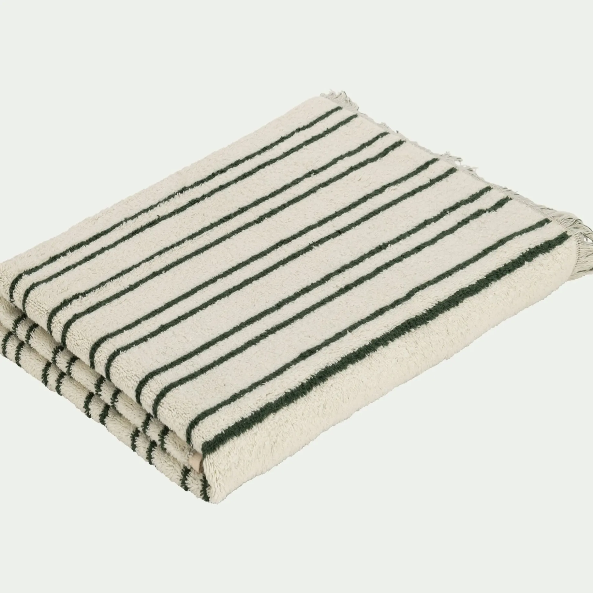 Découvrez la collection de linge de toilette Listra, fabriquée au Portugal. Nous vous présentons ici le drap de bain vert à rayures blanches, qui, comme tous les articles de cette gamme, vous offre une douceur quotidienne incomparable. Grâce à son grammage, cette serviette en 100x150cm vous enveloppe délicatement et permet un séchage rapide après la douche. Composé majoritairement de coton recyclé et certifié Oeko-Tex, cette grande serviette trouvera facilement sa place dans votre salle de bain. Explorez le reste de la collection pour créer un ensemble harmonieux.