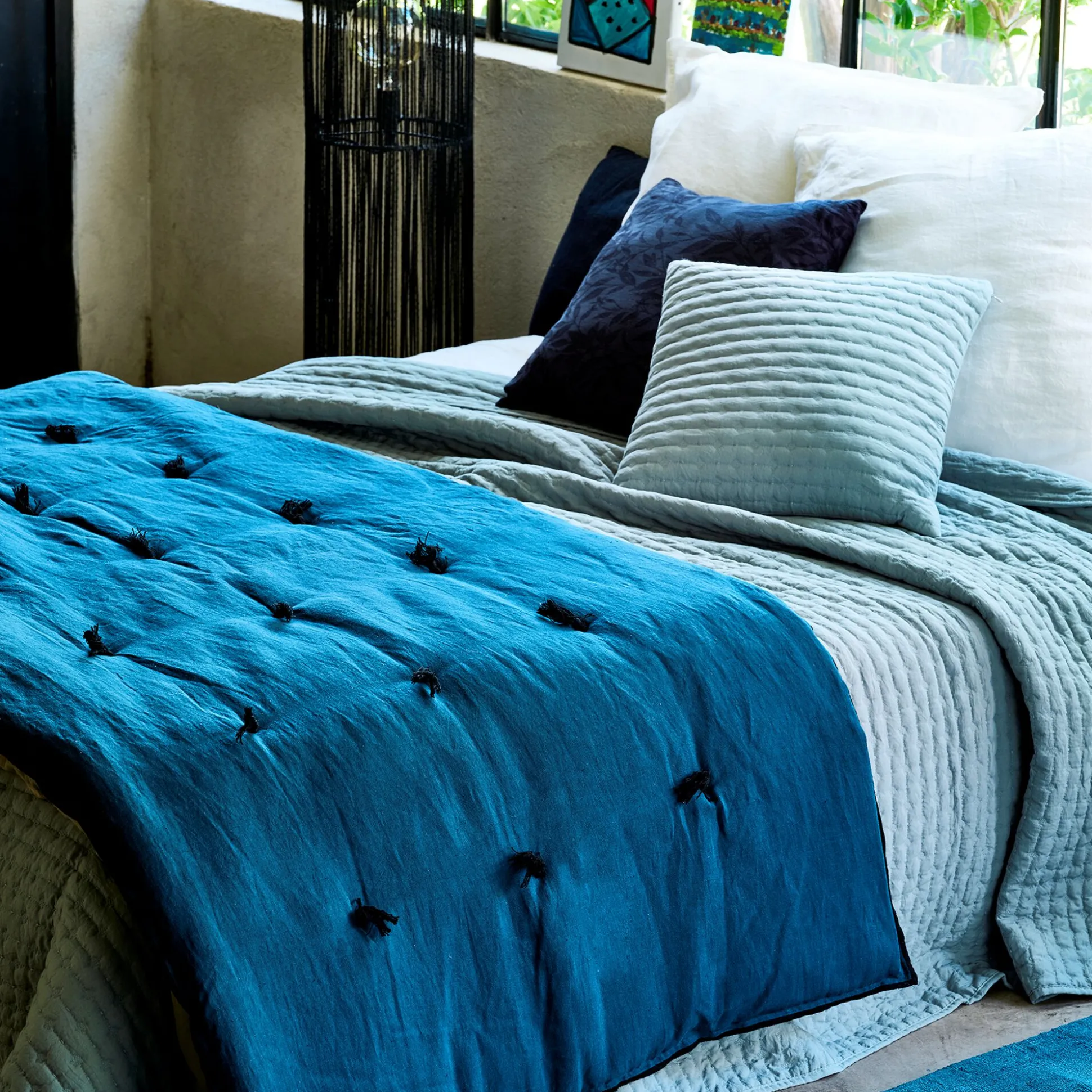 L’édredon Elina, d’un joli coloris bleu figuerolles rappelant les côtes méditerranéennes, est un accessoire textile indispensable lorsque l’on souhaite se créer un coin cocooning. Tissé en coton et lin, cet édredon sera aussi un élément déco pour votre lit.. Doux et confortable, il présente un gonflant inimitable grâce à ses 5 cm d’épaisseur. Invitation à la détente, sa robe arbore des détails en passepoil noirs : une garniture en relief située sur les bordures pour souligner les traits de l’édredon. Ce fin liseré est accompagné de quelques pompons pour une touche fantaisiste et bohème. Ce linge de maison saura vous couvrir de tendresse, de douceur et de chaleur.